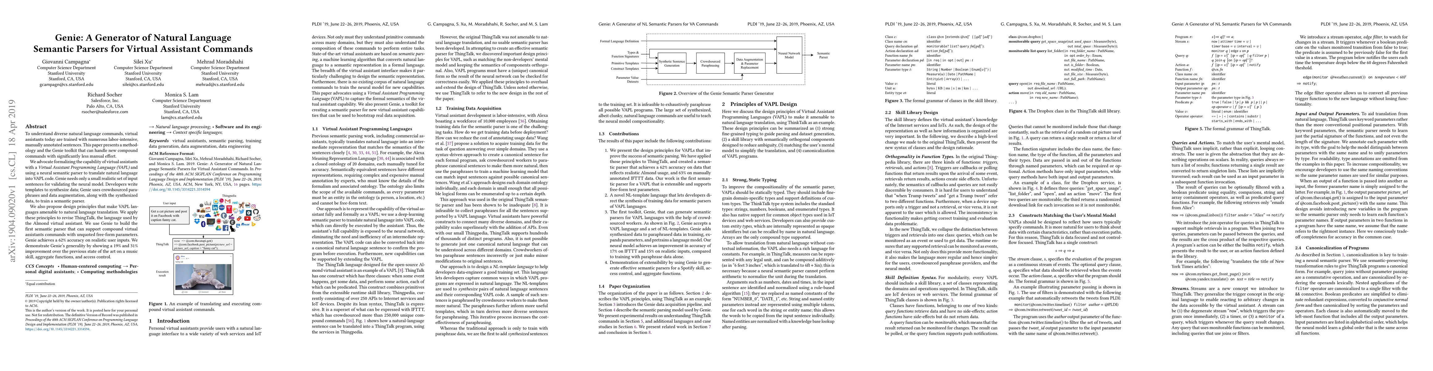 This paper introduces Genie, a toolkit for creating natural language semantic parsers with minimal manual effort, using a Virtual Assistant Programming Language (VAPL) and a neural semantic parser. Genie leverages crowdsourced paraphrases and data augmentation to train the parser, achieving 62% accuracy on realistic user inputs and outperforming previous methods by 19% and 31% on specific tasks.