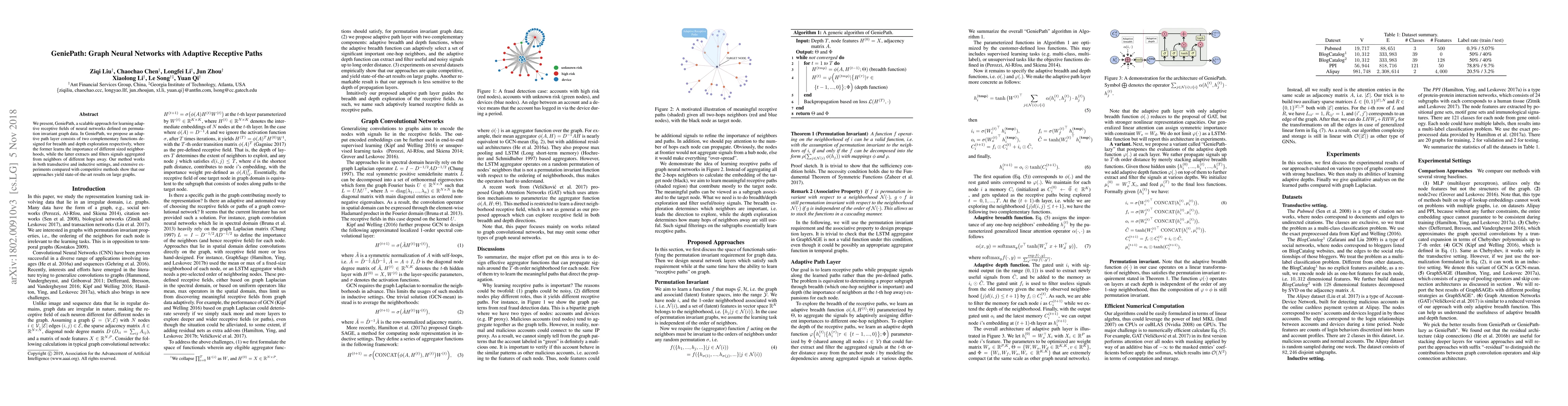 GeniePath proposes a scalable approach to learning adaptive receptive fields in neural networks for permutation invariant graph data, achieving state-of-the-art results on large graphs.