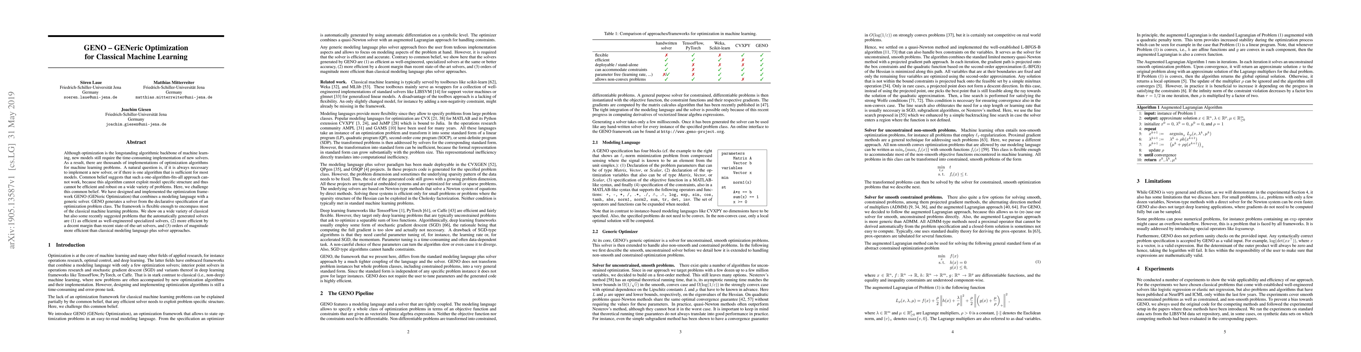 The GENO framework proposes a generic optimization approach for classical machine learning that automatically generates efficient solvers from problem specifications, demonstrating comparable or superior performance to specialized solvers. This challenges the notion that a one-algorithm-fits-all approach is infeasible.
