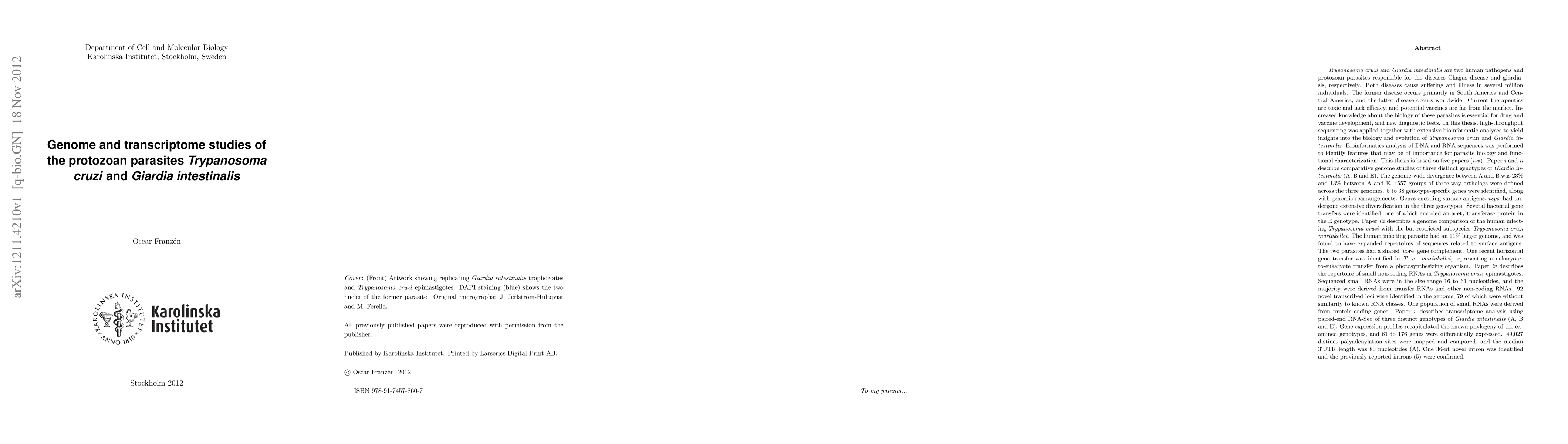 This research utilizes high-throughput sequencing and bioinformatics to study the genomes and transcriptomes of the protozoan parasites Trypanosoma cruzi and Giardia intestinalis, aiming to enhance understanding of their biology and evolution for better drug and vaccine development. The study includes comparative genome analyses of different Giardia genotypes and a comparison between human and bat-restricted Trypanosoma cruzi subspecies, alongside transcriptome analysis.