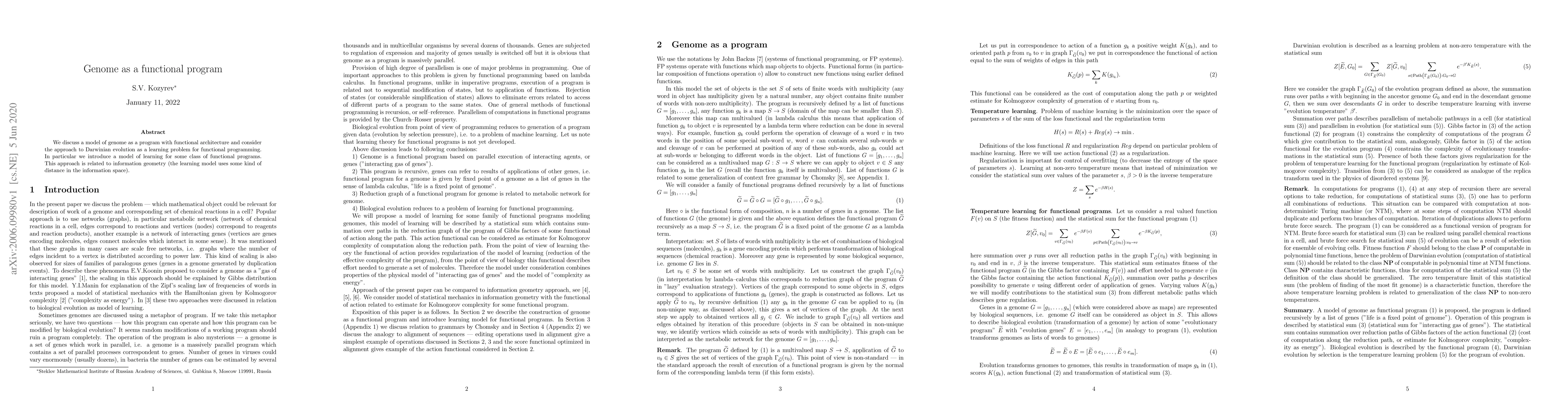 We discuss a model of genome as a program with functional architecture and consider the approach to Darwinian evolution as a learning problem for functional programming. In particular we introduce a model of learning for some class of functional programs. This approach is related to information geometry -- the learning model uses some kind of distance in the information space (the reduction graph of the model), we consider statistical sum over paths in the reduction graph and discuss relation of this sum to temperature learning.