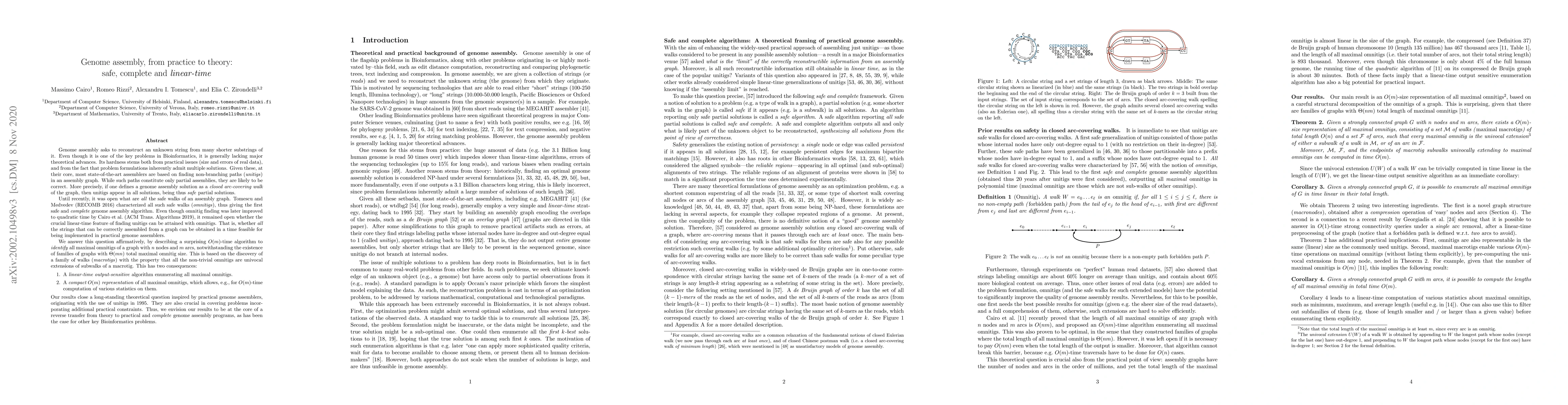 Genome assembly asks to reconstruct an unknown string from many shorter substrings of it. Even though it is one of the key problems in Bioinformatics, it is generally lacking major theoretical advances. Its hardness stems both from practical issues (size and errors of real data), and from the fact that problem formulations inherently admit multiple solutions. Given these, at their core, most state-of-the-art assemblers are based on finding non-branching paths (unitigs) in an assembly graph. If one defines a genome assembly solution as a closed arc-covering walk of the graph, then unitigs appear in all solutions, being thus safe partial solutions. All all such safe walks were recently characterized as omnitigs, leading to the first safe and complete genome assembly algorithm. Even if omnitig finding was improved to quadratic time, it remained open whether the crucial linear-time feature of finding unitigs can be attained with omnitigs. We describe a surprising $O(m)$-time algorithm to identify all maximal omnitigs of a graph with $n$ nodes and $m$ arcs, notwithstanding the existence of families of graphs with $\Theta(mn)$ total maximal omnitig size. This is based on the discovery of a family of walks (macrotigs) with the property that all the non-trivial omnitigs are univocal extensions of subwalks of a macrotig, with two consequences: (1) A linear-time output-sensitive algorithm enumerating all maximal omnitigs. (2) A compact $O(m)$ representation of all maximal omnitigs, which allows, e.g., for $O(m)$-time computation of various statistics on them. Our results close a long-standing theoretical question inspired by practical genome assemblers, originating with the use of unitigs in 1995. We envision our results to be at the core of a reverse transfer from theory to practical and complete genome assembly programs, as has been the case for other key Bioinformatics problems.