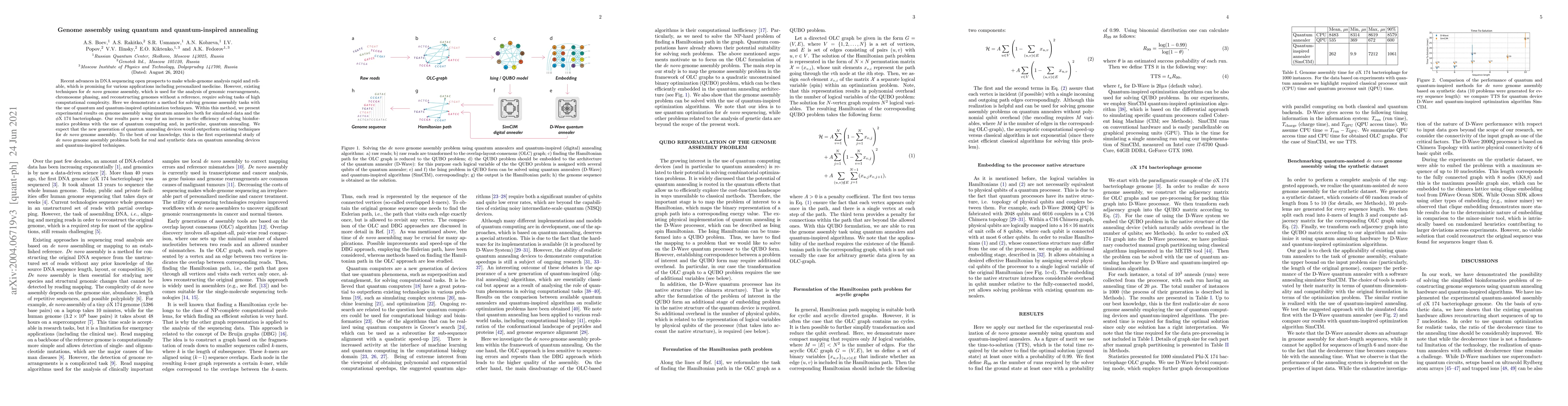 This paper explores the application of quantum and quantum-inspired annealing techniques to solve high-complexity genome assembly tasks, demonstrating improved efficiency over existing methods through experiments on both simulated and real data from the $\phi$X 174 bacteriophage. The study suggests that future quantum annealing devices could significantly outperform current techniques in de novo genome assembly.