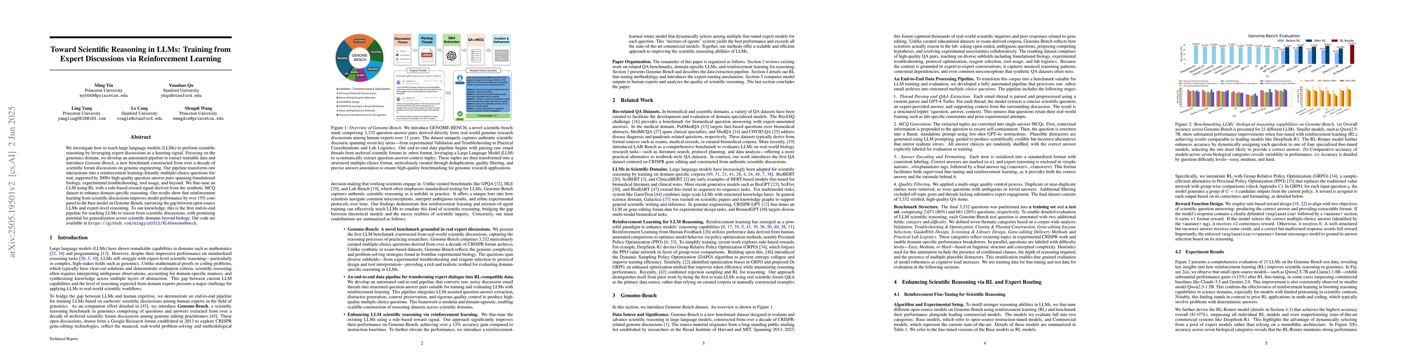 A new benchmark called Genome-Bench has been created to teach large language models to reason from scientific discussions on genome engineering. The benchmark is based on 3000+ high-quality question-answer pairs and has promising potential for generalization across scientific domains.