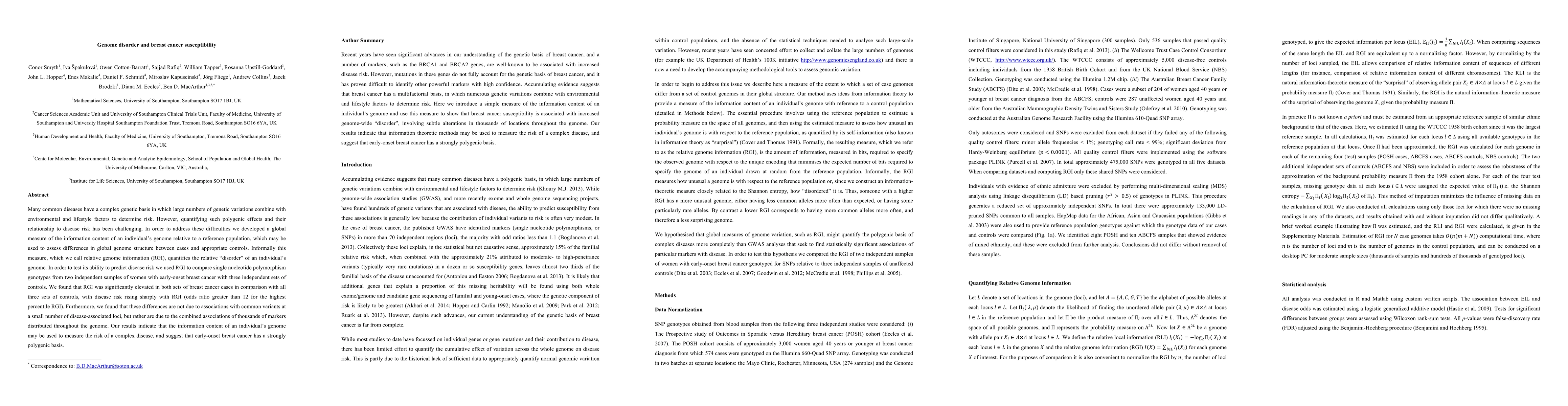 Many common diseases have a complex genetic basis in which large numbers of genetic variations combine with environmental and lifestyle factors to determine risk. However, quantifying such polygenic effects and their relationship to disease risk has been challenging. In order to address these difficulties we developed a global measure of the information content of an individual's genome relative to a reference population, which may be used to assess differences in global genome structure between cases and appropriate controls. Informally this measure, which we call relative genome information (RGI), quantifies the relative "disorder" of an individual's genome. In order to test its ability to predict disease risk we used RGI to compare single nucleotide polymorphism genotypes from two independent samples of women with early-onset breast cancer with three independent sets of controls. We found that RGI was significantly elevated in both sets of breast cancer cases in comparison with all three sets of controls, with disease risk rising sharply with RGI (odds ratio greater than 12 for the highest percentile RGI). Furthermore, we found that these differences are not due to associations with common variants at a small number of disease-associated loci, but rather are due to the combined associations of thousands of markers distributed throughout the genome. Our results indicate that the information content of an individual's genome may be used to measure the risk of a complex disease, and suggest that early-onset breast cancer has a strongly polygenic basis.