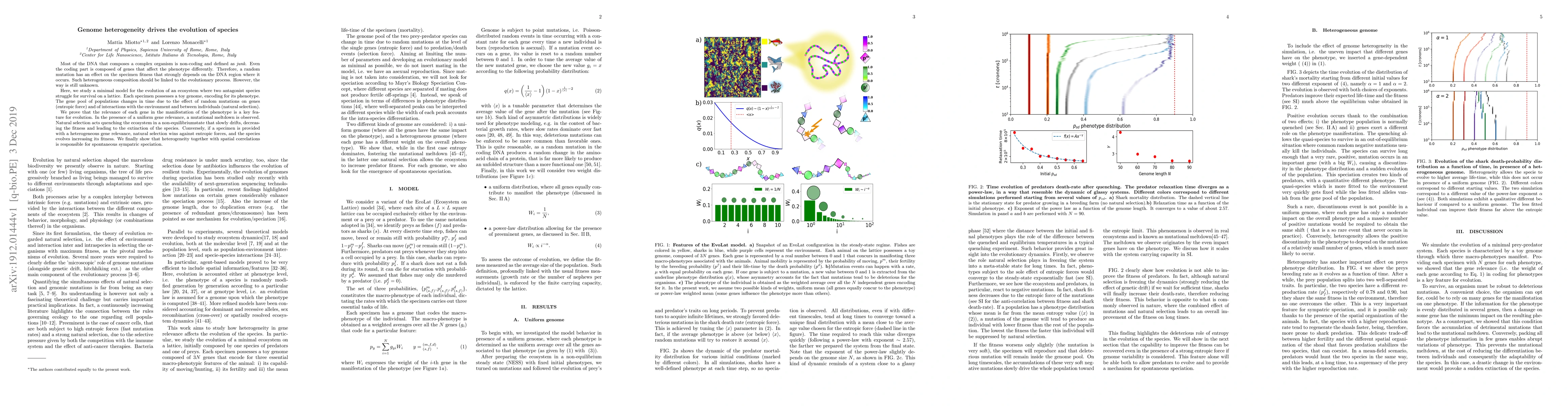 Most of the DNA that composes a complex organism is non-coding and defined as junk. Even the coding part is composed of genes that affect the phenotype differently. Therefore, a random mutation has an effect on the specimen fitness that strongly depends on the DNA region where it occurs. Such heterogeneous composition should be linked to the evolutionary process. However, the way is still unknown. Here, we study a minimal model for the evolution of an ecosystem where two antagonist species struggle for survival on a lattice. Each specimen possesses a toy genome, encoding for its phenotype. The gene pool of populations changes in time due to the effect of random mutations on genes (entropic force) and of interactions with the environment and between individuals (natural selection). We prove that the relevance of each gene in the manifestation of the phenotype is a key feature for evolution. In the presence of a uniform gene relevance, a mutational meltdown is observed. Natural selection acts quenching the ecosystem in a non-equilibriumstate that slowly drifts, decreasing the fitness and leading to the extinction of the species. Conversely, if a specimen is provided with a heterogeneous gene relevance, natural selection wins against entropic forces, and the species evolves increasing its fitness. We finally show that heterogeneity together with spatial correlations is responsible for spontaneous sympatric speciation.