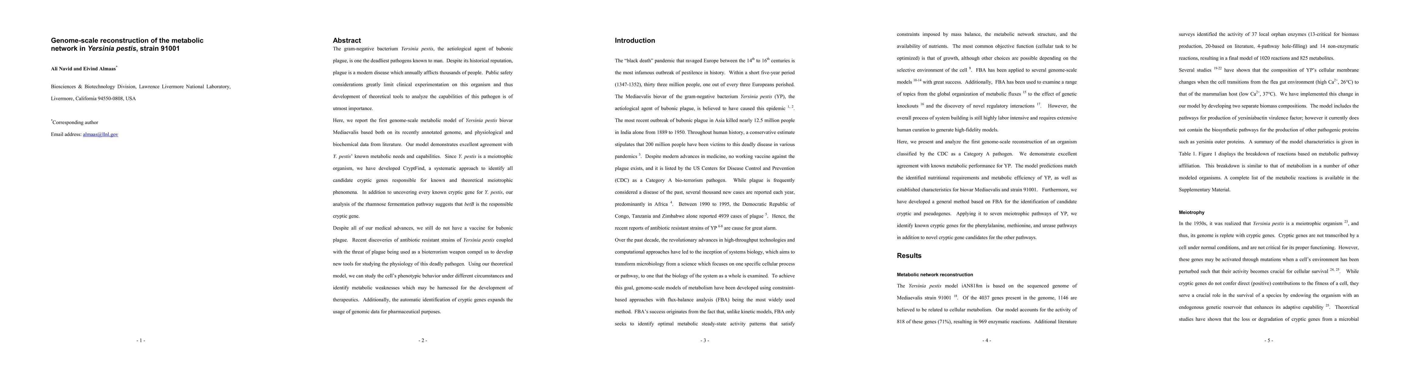The gram-negative bacterium Yersinia pestis, the aetiological agent of bubonic plague, is one the deadliest pathogens known to man. Despite its historical reputation, plague is a modern disease which annually afflicts thousands of people. Public safety considerations greatly limit clinical experimentation on this organism and thus development of theoretical tools to analyze the capabilities of this pathogen is of utmost importance. Here, we report the first genome-scale metabolic model of Yersinia pestis biovar Mediaevalis based both on its recently annotated genome, and physiological and biochemical data from literature. Our model demonstrates excellent agreement with Y. pestis known metabolic needs and capabilities. Since Y. pestis is a meiotrophic organism, we have developed CryptFind, a systematic approach to identify all candidate cryptic genes responsible for known and theoretical meiotrophic phenomena. In addition to uncovering every known cryptic gene for Y. pestis, our analysis of the rhamnose fermentation pathway suggests that betB is the responsible cryptic gene. Despite all of our medical advances, we still do not have a vaccine for bubonic plague. Recent discoveries of antibiotic resistant strains of Yersinia pestis coupled with the threat of plague being used as a bioterrorism weapon compel us to develop new tools for studying the physiology of this deadly pathogen. Using our theoretical model, we can study the cells phenotypic behavior under different circumstances and identify metabolic weaknesses which may be harnessed for the development of therapeutics. Additionally, the automatic identification of cryptic genes expands the usage of genomic data for pharmaceutical purposes.