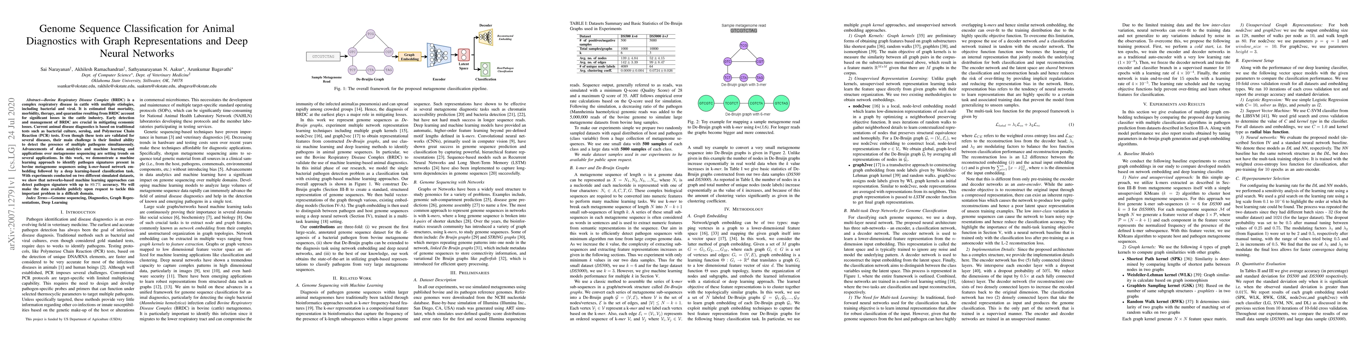 Bovine Respiratory Disease Complex (BRDC) is a complex respiratory disease in cattle with multiple etiologies, including bacterial and viral. It is estimated that mortality, morbidity, therapy, and quarantine resulting from BRDC account for significant losses in the cattle industry. Early detection and management of BRDC are crucial in mitigating economic losses. Current animal disease diagnostics is based on traditional tests such as bacterial culture, serolog, and Polymerase Chain Reaction (PCR) tests. Even though these tests are validated for several diseases, their main challenge is their limited ability to detect the presence of multiple pathogens simultaneously. Advancements of data analytics and machine learning and applications over metagenome sequencing are setting trends on several applications. In this work, we demonstrate a machine learning approach to identify pathogen signatures present in bovine metagenome sequences using k-mer-based network embedding followed by a deep learning-based classification task. With experiments conducted on two different simulated datasets, we show that networks-based machine learning approaches can detect pathogen signature with up to 89.7% accuracy. We will make the data available publicly upon request to tackle this important problem in a difficult domain.