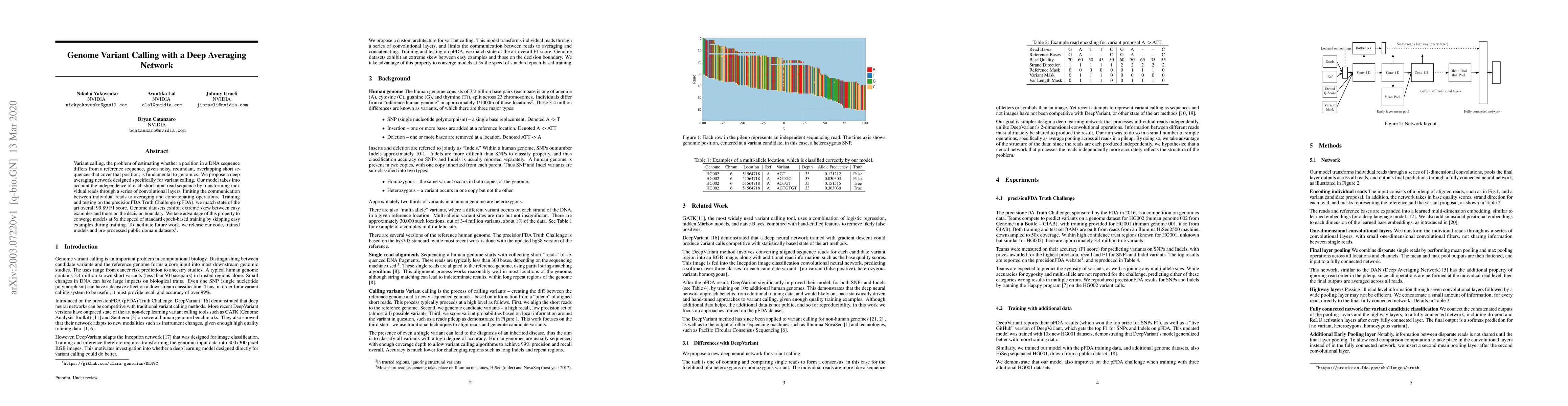 A new deep learning model called a Deep Averaging Network outperforms existing methods for variant calling in genomics with an overall 99.89 F1 score. The model converges faster by skipping easy examples during training and is made available to facilitate future work.