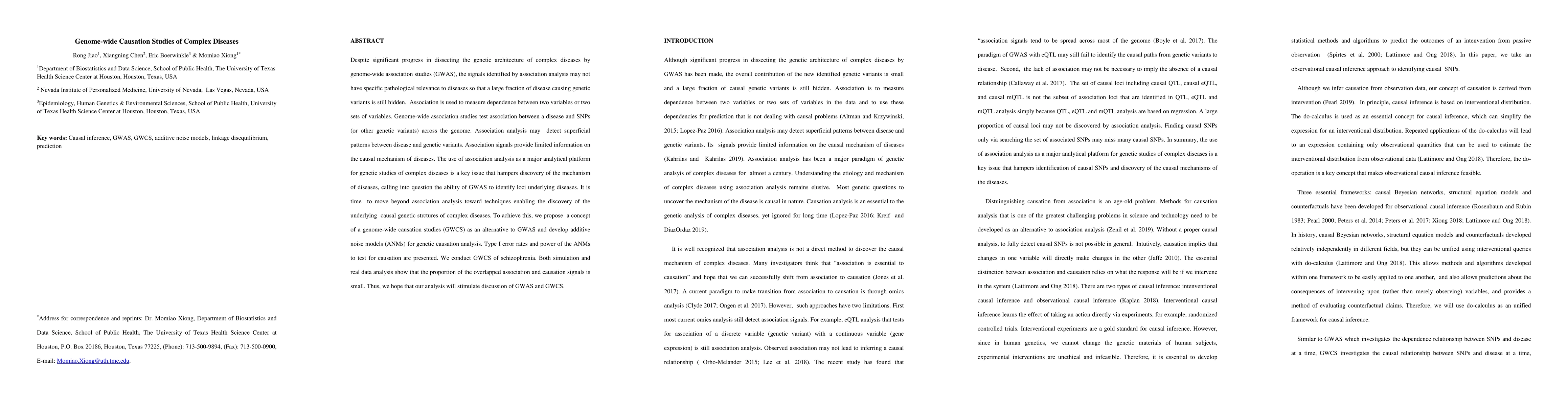 This paper critiques the limitations of genome-wide association studies (GWAS) in identifying causal genetic variants for complex diseases and proposes genome-wide causation studies (GWCS) as an alternative. It introduces additive noise models (ANMs) for genetic causation analysis and demonstrates their effectiveness through simulations and real data analysis on schizophrenia, showing minimal overlap between association and causation signals.