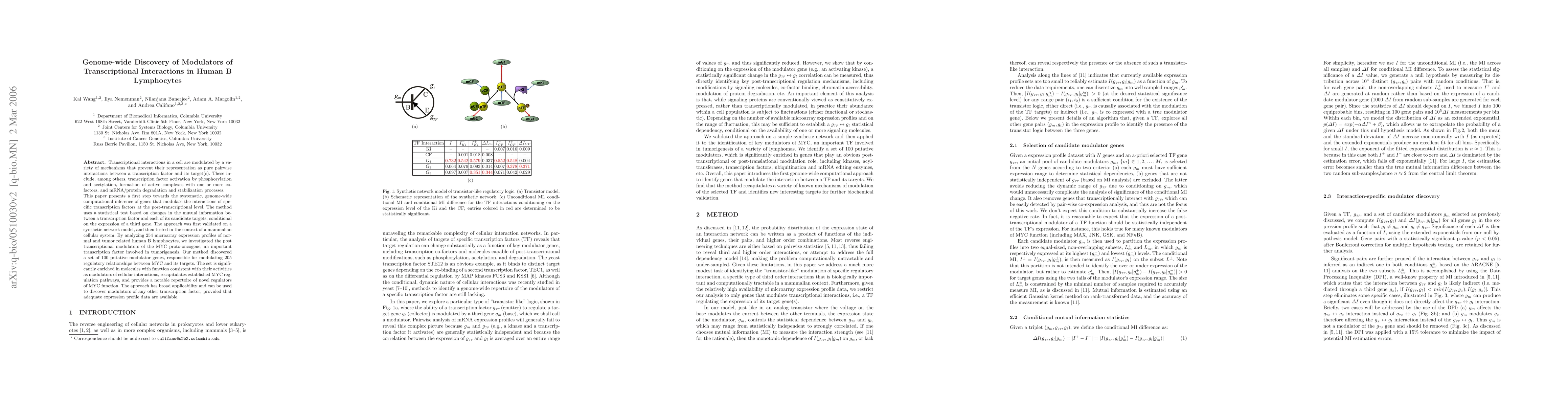 Transcriptional interactions in a cell are modulated by a variety of mechanisms that prevent their representation as pure pairwise interactions between a transcription factor and its target(s). These include, among others, transcription factor activation by phosphorylation and acetylation, formation of active complexes with one or more co-factors, and mRNA/protein degradation and stabilization processes. This paper presents a first step towards the systematic, genome-wide computational inference of genes that modulate the interactions of specific transcription factors at the post-transcriptional level. The method uses a statistical test based on changes in the mutual information between a transcription factor and each of its candidate targets, conditional on the expression of a third gene. The approach was first validated on a synthetic network model, and then tested in the context of a mammalian cellular system. By analyzing 254 microarray expression profiles of normal and tumor related human B lymphocytes, we investigated the post transcriptional modulators of the MYC proto-oncogene, an important transcription factor involved in tumorigenesis. Our method discovered a set of 100 putative modulator genes, responsible for modulating 205 regulatory relationships between MYC and its targets. The set is significantly enriched in molecules with function consistent with their activities as modulators of cellular interactions, recapitulates established MYC regulation pathways, and provides a notable repertoire of novel regulators of MYC function. The approach has broad applicability and can be used to discover modulators of any other transcription factor, provided that adequate expression profile data are available.