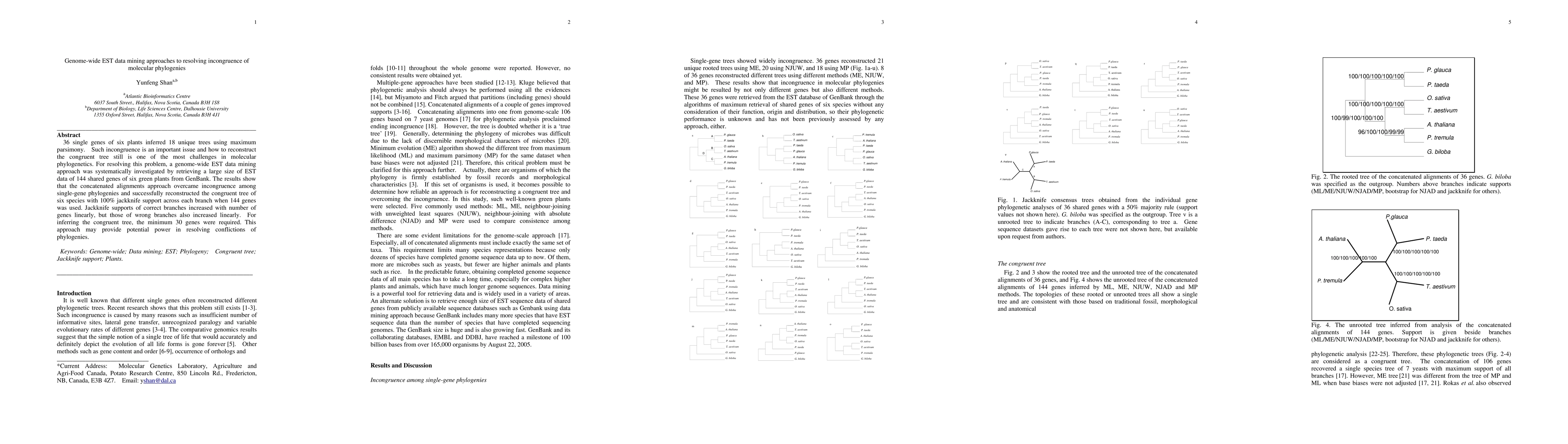 36 single genes of six plants inferred 18 unique trees using maximum parsimony. Such incongruence is an important issue and how to reconstruct the congruent tree still is one of the most challenges in molecular phylogenetics. For resolving this problem, a genome-wide EST data mining approach was systematically investigated by retrieving a large size of EST data of 144 shared genes of six green plants from GenBank. The results show that the concatenated alignments approach overcame incongruence among single-gene phylogenies and successfully reconstructed the congruent tree of six species with 100% jackknife support across each branch when 144 genes was used. Jackknife supports of correct branches increased with number of genes linearly, but those of wrong branches also increased linearly. For inferring the congruent tree, the minimum 30 genes were required. This approach may provide potential power in resolving conflictions of phylogenies. Keywords: Genome-wide; Data mining; EST; Phylogeny; Congruent tree; Jackknife support; Plants.
