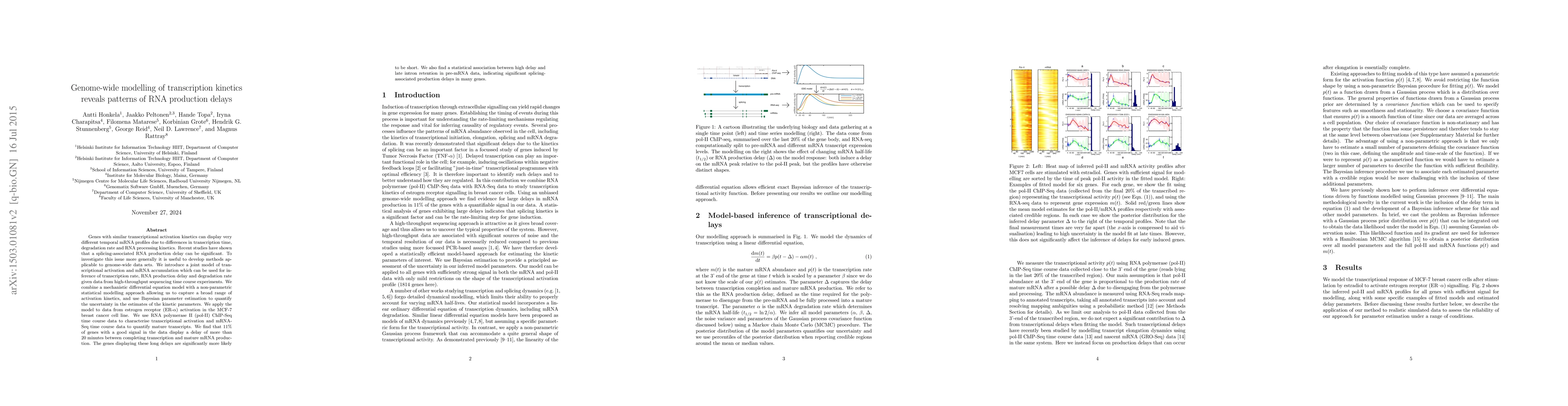 Genes with similar transcriptional activation kinetics can display very different temporal mRNA profiles due to differences in transcription time, degradation rate and RNA processing kinetics. Recent studies have shown that a splicing-associated RNA production delay can be significant. We introduce a joint model of transcriptional activation and mRNA accumulation which can be used for inference of transcription rate, RNA production delay and degradation rate given genome-wide data from high-throughput sequencing time course experiments. We combine a mechanistic differential equation model with a non-parametric statistical modelling approach allowing us to capture a broad range of activation kinetics, and use Bayesian parameter estimation to quantify the uncertainty in the estimates of the kinetic parameters. We apply the model to data from estrogen receptor (ER-{\alpha}) activation in the MCF-7 breast cancer cell line. We use RNA polymerase II (pol-II) ChIP-Seq time course data to characterise transcriptional activation and mRNA-Seq time course data to quantify mature transcripts. We find that 11% of genes with a good signal in the data display a delay of more than 20 minutes between completing transcription and mature mRNA production. The genes displaying these long delays are significantly more likely to be short. We also find a statistical association between high delay and late intron retention in pre-mRNA data, indicating significant splicing-associated production delays in many genes.
