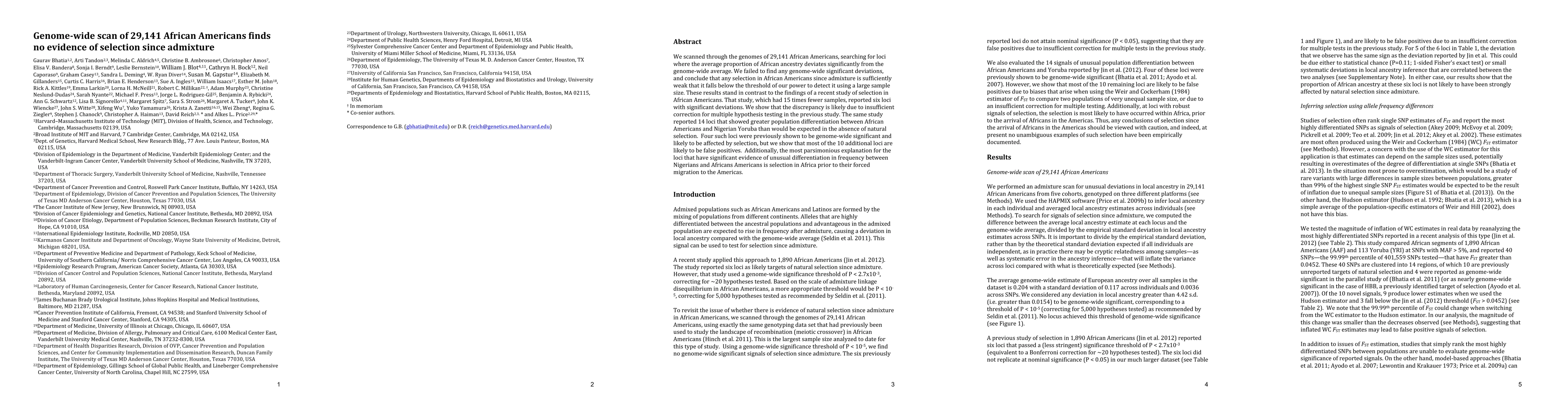 This study of 29,141 African Americans' genomes found no evidence of selection since admixture, contrasting with a smaller study that reported significant deviations likely due to insufficient multiple hypothesis testing correction. Most additional loci showing unusual differentiation are likely false positives, with selection likely occurring in Africa prior to migration.