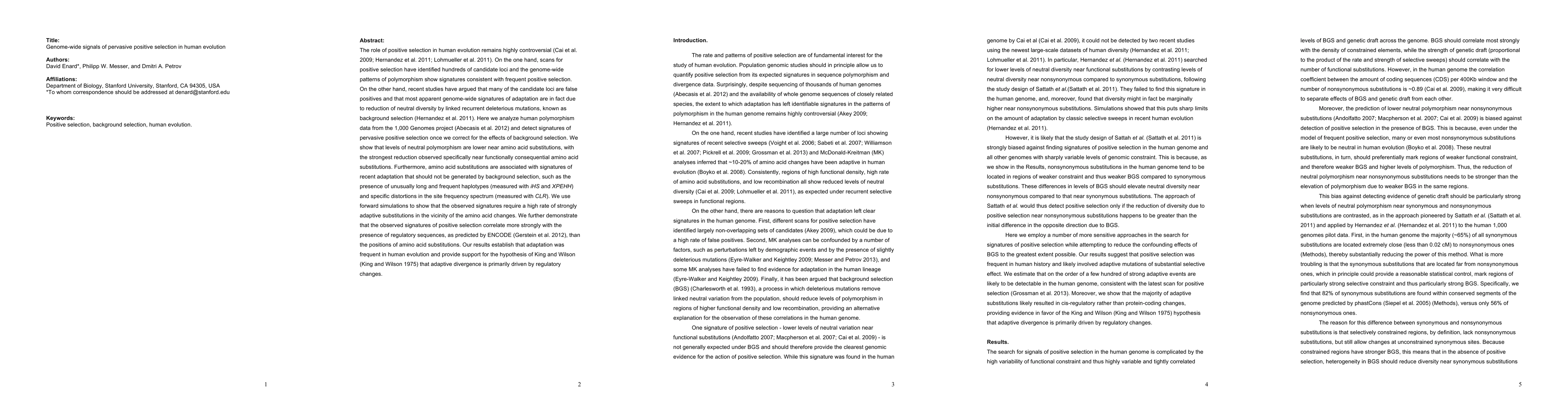 The role of positive selection in human evolution remains controversial. On the one hand, scans for positive selection have identified hundreds of candidate loci and the genome-wide patterns of polymorphism show signatures consistent with frequent positive selection. On the other hand, recent studies have argued that many of the candidate loci are false positives and that most apparent genome-wide signatures of adaptation are in fact due to reduction of neutral diversity by linked recurrent deleterious mutations, known as background selection. Here we analyze human polymorphism data from the 1,000 Genomes project (Abecasis et al. 2012) and detect signatures of pervasive positive selection once we correct for the effects of background selection. We show that levels of neutral polymorphism are lower near amino acid substitutions, with the strongest reduction observed specifically near functionally consequential amino acid substitutions. Furthermore, amino acid substitutions are associated with signatures of recent adaptation that should not be generated by background selection, such as the presence of unusually long and frequent haplotypes and specific distortions in the site frequency spectrum. We use forward simulations to show that the observed signatures require a high rate of strongly adaptive substitutions in the vicinity of the amino acid changes. We further demonstrate that the observed signatures of positive selection correlate more strongly with the presence of regulatory sequences, as predicted by ENCODE (Gerstein et al. 2012), than the positions of amino acid substitutions. Our results establish that adaptation was frequent in human evolution and provide support for the hypothesis of King and Wilson (King and Wilson 1975) that adaptive divergence is primarily driven by regulatory changes.