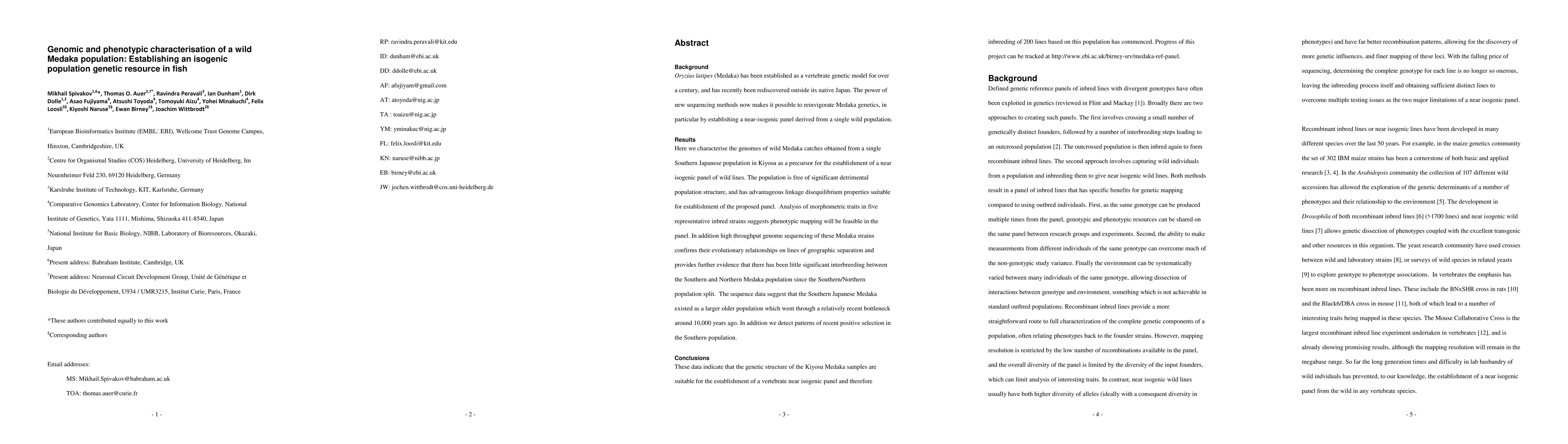 Background Oryzias latipes (Medaka) has been established as a vertebrate genetic model for over a century, and has recently been rediscovered outside its native Japan. The power of new sequencing methods now makes it possible to reinvigorate Medaka genetics, in particular by establishing a near-isogenic panel derived from a single wild population. Results Here we characterise the genomes of wild Medaka catches obtained from a single Southern Japanese population in Kiyosu as a precursor for the establishment of a near isogenic panel of wild lines. The population is free of significant detrimental population structure, and has advantageous linkage disequilibrium properties suitable for establishment of the proposed panel. Analysis of morphometric traits in five representative inbred strains suggests phenotypic mapping will be feasible in the panel. In addition high throughput genome sequencing of these Medaka strains confirms their evolutionary relationships on lines of geographic separation and provides further evidence that there has been little significant interbreeding between the Southern and Northern Medaka population since the Southern/Northern population split. The sequence data suggest that the Southern Japanese Medaka existed as a larger older population which went through a relatively recent bottleneck around 10,000 years ago. In addition we detect patterns of recent positive selection in the Southern population. Conclusions These data indicate that the genetic structure of the Kiyosu Medaka samples are suitable for the establishment of a vertebrate near isogenic panel and therefore inbreeding of 200 lines based on this population has commenced. Progress of this project can be tracked at http://www.ebi.ac.uk/birney-srv/medaka-ref-panel
