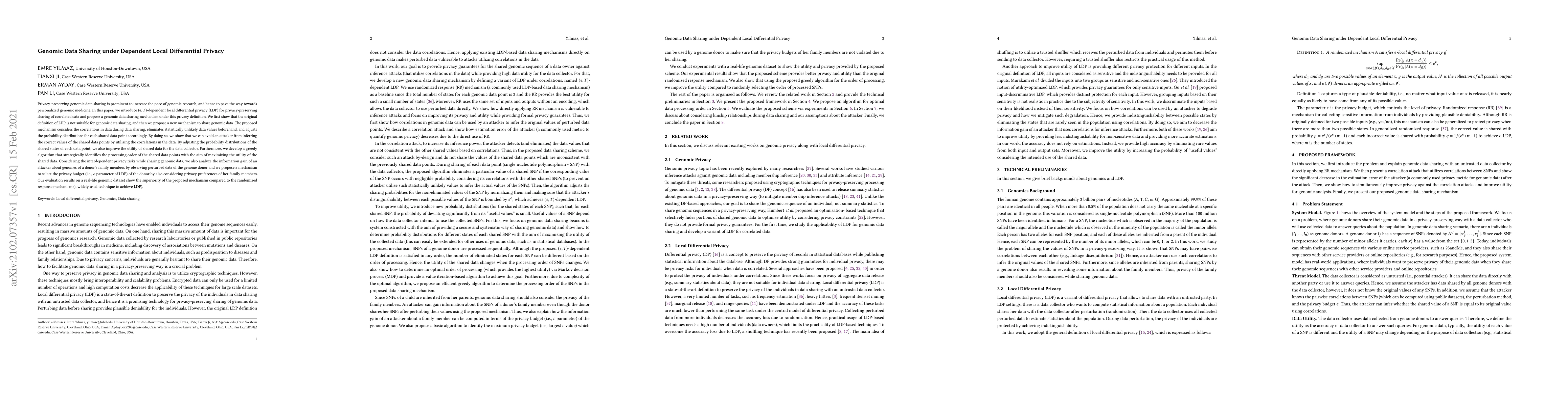 Privacy-preserving genomic data sharing is prominent to increase the pace of genomic research, and hence to pave the way towards personalized genomic medicine. In this paper, we introduce ($\epsilon , T$)-dependent local differential privacy (LDP) for privacy-preserving sharing of correlated data and propose a genomic data sharing mechanism under this privacy definition. We first show that the original definition of LDP is not suitable for genomic data sharing, and then we propose a new mechanism to share genomic data. The proposed mechanism considers the correlations in data during data sharing, eliminates statistically unlikely data values beforehand, and adjusts the probability distributions for each shared data point accordingly. By doing so, we show that we can avoid an attacker from inferring the correct values of the shared data points by utilizing the correlations in the data. By adjusting the probability distributions of the shared states of each data point, we also improve the utility of shared data for the data collector. Furthermore, we develop a greedy algorithm that strategically identifies the processing order of the shared data points with the aim of maximizing the utility of the shared data. Considering the interdependent privacy risks while sharing genomic data, we also analyze the information gain of an attacker about genomes of a donor's family members by observing perturbed data of the genome donor and we propose a mechanism to select the privacy budget (i.e., $\epsilon$ parameter of LDP) of the donor by also considering privacy preferences of her family members. Our evaluation results on a real-life genomic dataset show the superiority of the proposed mechanism compared to the randomized response mechanism (a widely used technique to achieve LDP).