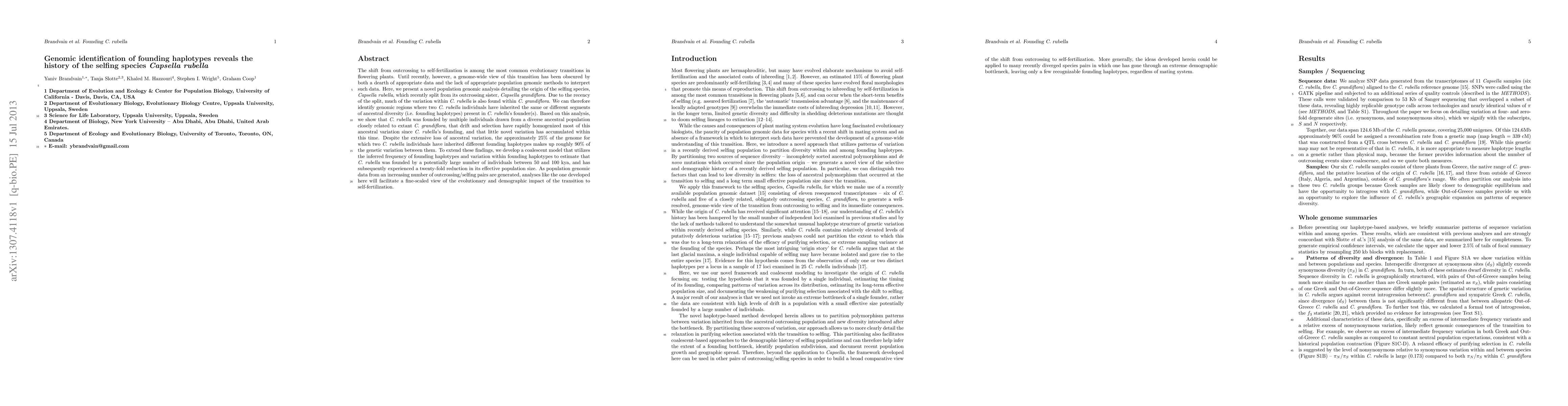 The shift from outcrossing to self-fertilization is among the most common transitions in plants. Until recently, however, a genome-wide view of this transition has been obscured by a dearth of appropriate data and the lack of appropriate population genomic methods to interpret such data. Here, we present novel analyses detailing the origin of the selfing species, Capsella rubella, which recently split from its outcrossing sister, Capsella grandiflora. Due to the recency of the split, most variation within C. rubella is found within C. grandiflora. We can therefore identify genomic regions where two C. rubella individuals have inherited the same or different segments of ancestral diversity (i.e. founding haplotypes) present in C. rubella's founder(s). Based on this analysis, we show that C. rubella was founded by multiple individuals drawn from a diverse ancestral population closely related to extant C. grandiflora, that drift and selection have rapidly homogenized most of this ancestral variation since C. rubella's founding, and that little novel variation has accumulated within this time. Despite the extensive loss of ancestral variation, the approximately 25% of the genome for which two C. rubella individuals have inherited different founding haplotypes makes up roughly 90% of the genetic variation between them. To extend these findings, we develop a coalescent model that utilizes the inferred frequency of founding haplotypes and variation within founding haplotypes to estimate that C. rubella was founded by a potentially large number of individuals 50-100 kya, and has subsequently experienced a 20X reduction in its effective population size. As population genomic data from an increasing number of outcrossing/selfing pairs are generated, analyses like this here will facilitate a fine-scaled view of the evolutionary and demographic impact of the transition to self-fertilization.