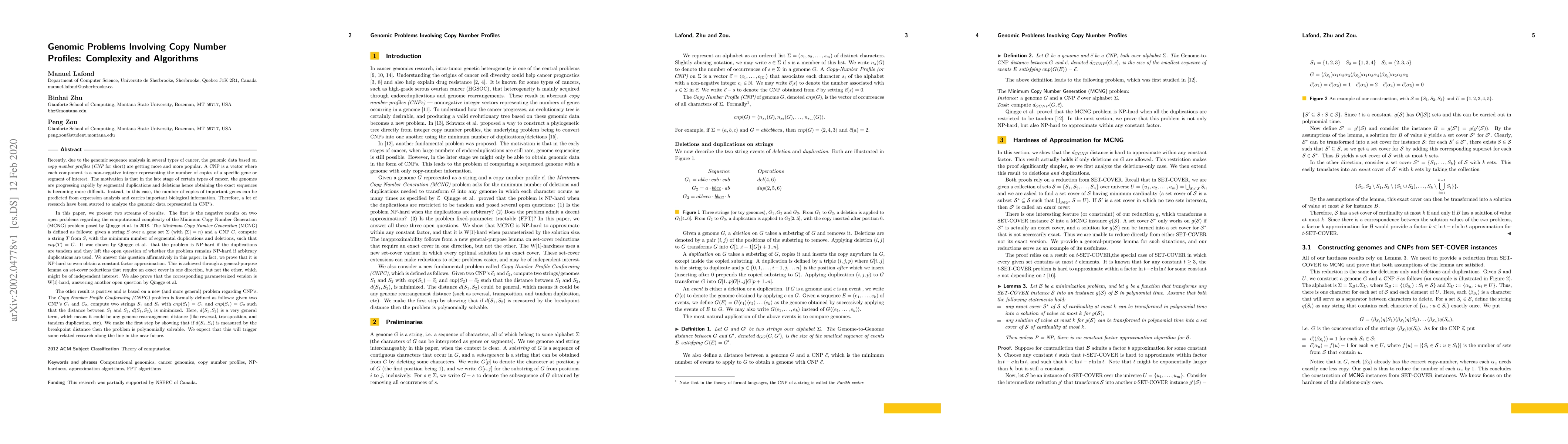 This paper addresses the complexity of genomic problems involving copy number profiles (CNPs) in cancer analysis. It confirms the NP-hardness of the Minimum Copy Number Generation (MCNG) problem with arbitrary duplications and proves its W[1]-hardness in the parameterized version. Additionally, it introduces the Copy Number Profile Conforming (CNPC) problem and shows that it is polynomially solvable when the distance between CNPs is measured by the breakpoint distance.