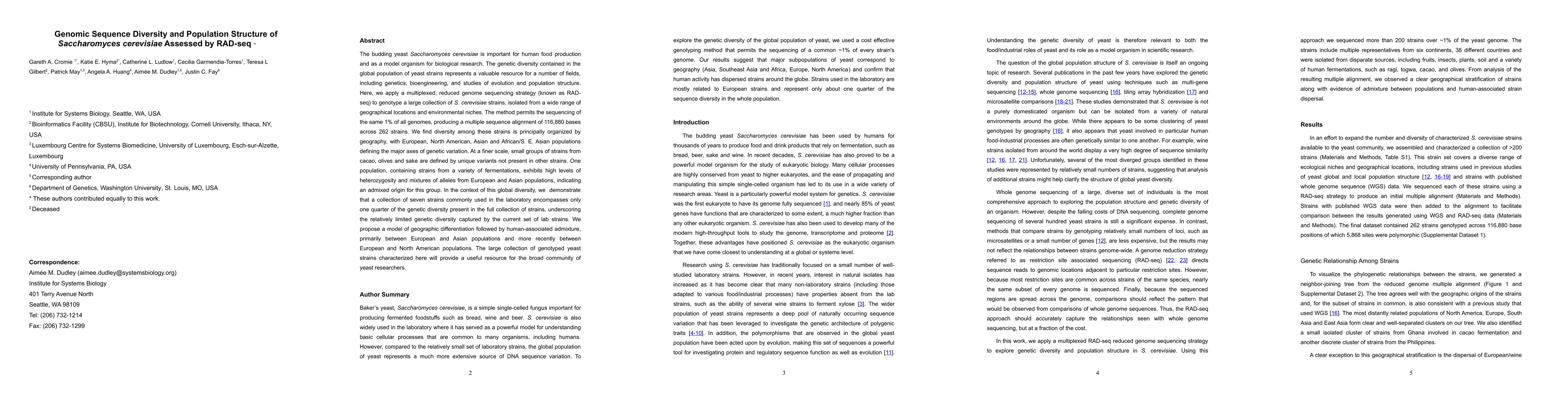 This study uses RAD-seq to analyze the genetic diversity and population structure of Saccharomyces cerevisiae, revealing that geographic origin is the primary factor organizing genetic variation. The research highlights the limited genetic diversity of commonly used lab strains compared to the global collection, suggesting a model of geographic differentiation followed by human-mediated admixture.