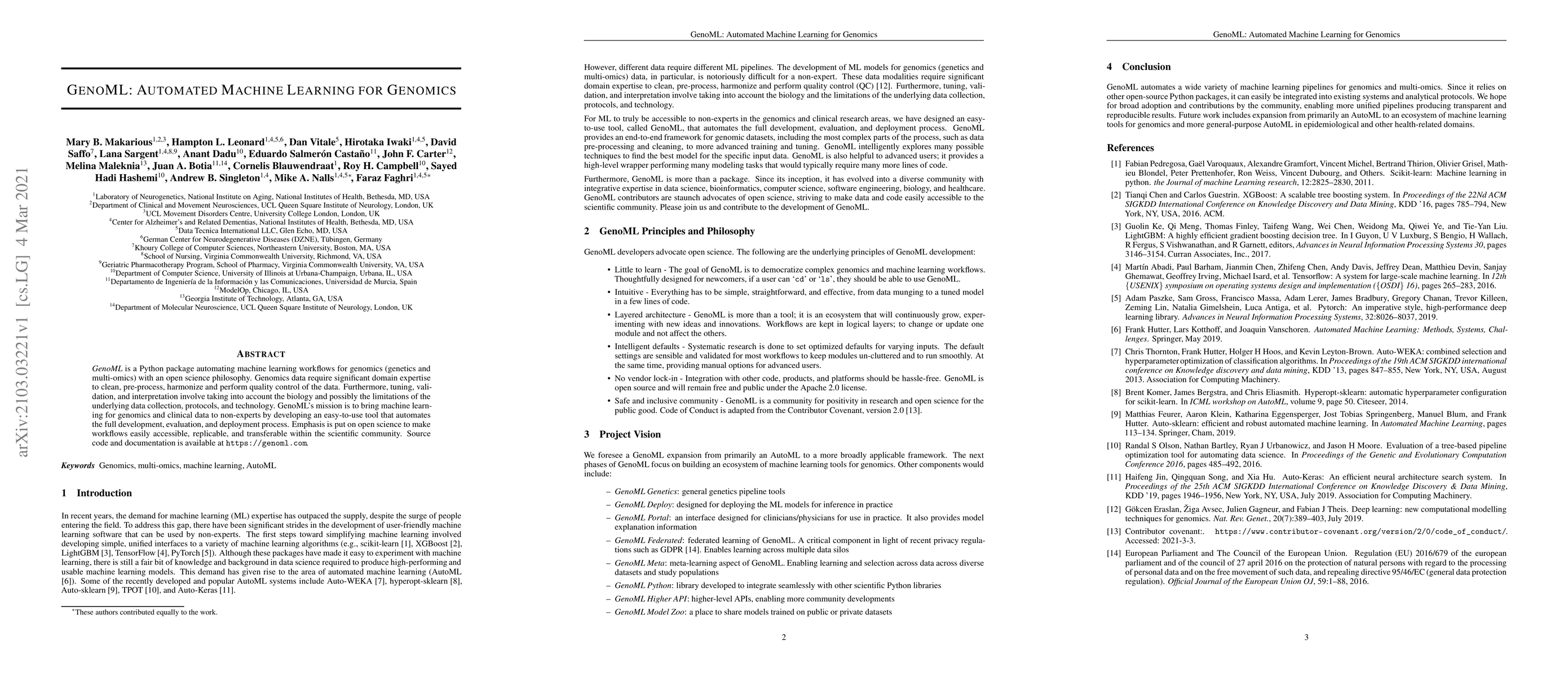 GenoML is a Python package designed to automate machine learning workflows for genomics, aiming to simplify the complex processes involved in data cleaning, preprocessing, and analysis for non-experts. It emphasizes open science to ensure workflows are accessible, replicable, and transferable.