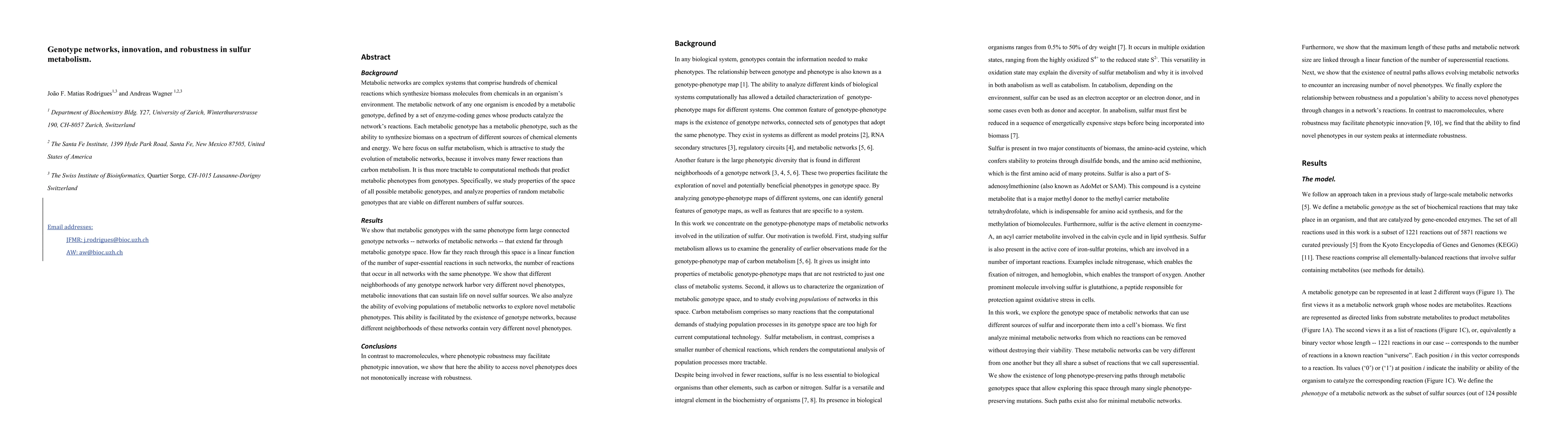 Metabolic networks are complex systems that comprise hundreds of chemical reactions which synthesize biomass molecules from chemicals in an organism's environment. The metabolic network of any one organism is encoded by a metabolic genotype, defined by a set of enzyme-coding genes whose products catalyze the network's reactions. Each metabolic genotype has a metabolic phenotype, such as the ability to synthesize biomass on a spectrum of different sources of chemical elements and energy. We here focus on sulfur metabolism, which is attractive to study the evolution of metabolic networks, because it involves many fewer reactions than carbon metabolism. Specifically, we study properties of the space of all possible metabolic genotypes, and analyze properties of random metabolic genotypes that are viable on different numbers of sulfur sources. We show that metabolic genotypes with the same phenotype form large connected genotype networks that extend far through metabolic genotype space. How far they reach through this space is a linear function of the number of super-essential reactions in such networks, the number of reactions that occur in all networks with the same phenotype. We show that different neighborhoods of any genotype network harbor very different novel phenotypes, metabolic innovations that can sustain life on novel sulfur sources. We also analyze the ability of evolving populations of metabolic networks to explore novel metabolic phenotypes. This ability is facilitated by the existence of genotype networks, because different neighborhoods of these networks contain very different novel phenotypes. In contrast to macromolecules, where phenotypic robustness may facilitate phenotypic innovation, we show that here the ability to access novel phenotypes does not monotonically increase with robustness.