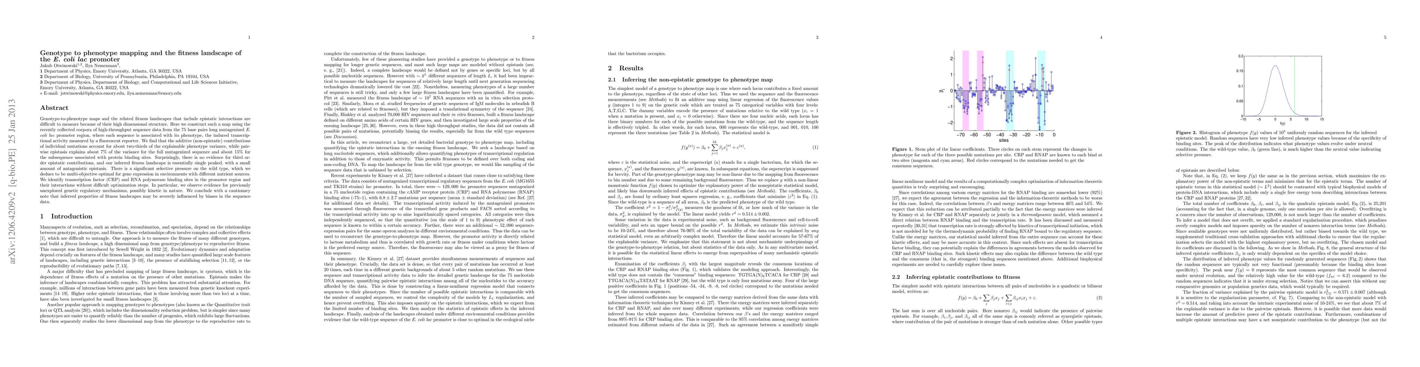 Genotype-to-phenotype maps and the related fitness landscapes that include epistatic interactions are difficult to measure because of their high dimensional structure. Here we construct such a map using the recently collected corpora of high-throughput sequence data from the 75 base pairs long mutagenized E. coli lac promoter region, where each sequence is associated with its phenotype, the induced transcriptional activity measured by a fluorescent reporter. We find that the additive (non-epistatic) contributions of individual mutations account for about two-thirds of the explainable phenotype variance, while pairwise epistasis explains about 7% of the variance for the full mutagenized sequence and about 15% for the subsequence associated with protein binding sites. Surprisingly, there is no evidence for third order epistatic contributions, and our inferred fitness landscape is essentially single peaked, with a small amount of antagonistic epistasis. There is a significant selective pressure on the wild type, which we deduce to be multi-objective optimal for gene expression in environments with different nutrient sources. We identify transcription factor (CRP) and RNA polymerase binding sites in the promotor region and their interactions without difficult optimization steps. In particular, we observe evidence for previously unexplored genetic regulatory mechanisms, possibly kinetic in nature. We conclude with a cautionary note that inferred properties of fitness landscapes may be severely influenced by biases in the sequence data.
