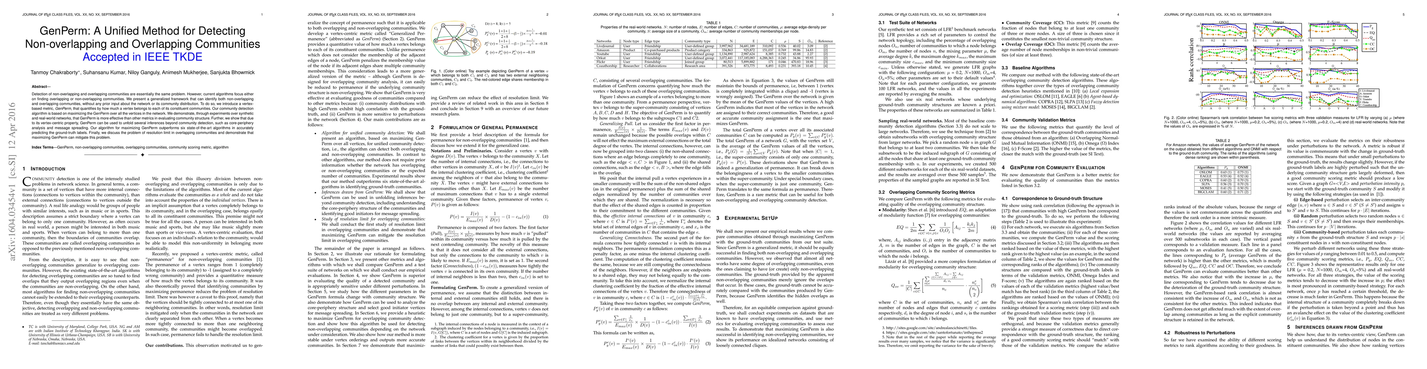 GenPerm is a novel method for detecting both non-overlapping and overlapping communities in networks by maximizing a vertex-based metric. It outperforms existing algorithms and can also facilitate additional network analyses like core-periphery structure and message diffusion.