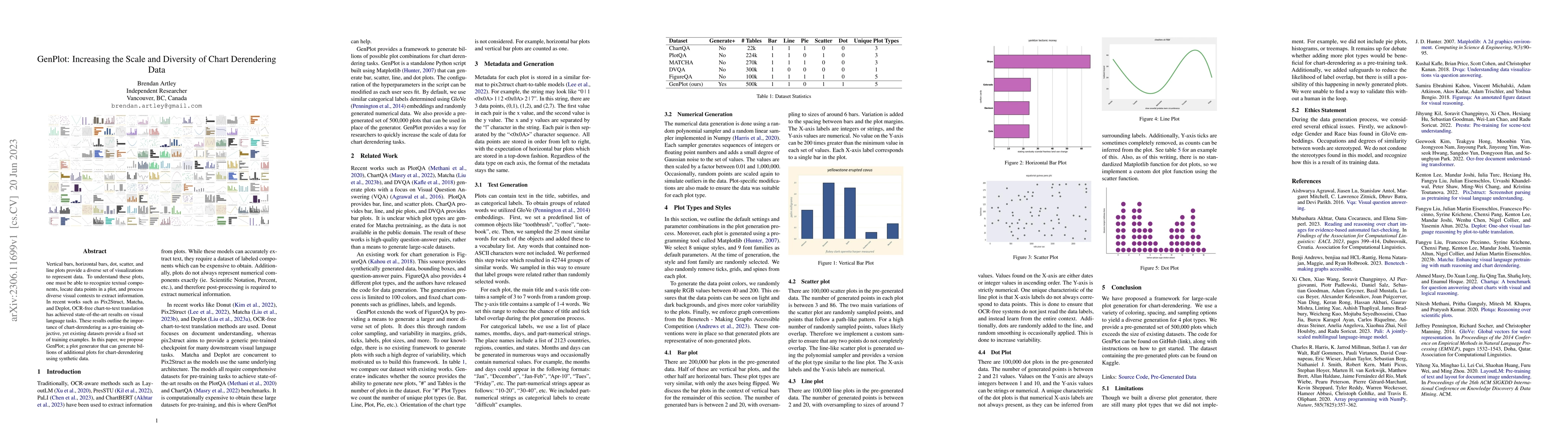 Vertical bars, horizontal bars, dot, scatter, and line plots provide a diverse set of visualizations to represent data. To understand these plots, one must be able to recognize textual components, locate data points in a plot, and process diverse visual contexts to extract information. In recent works such as Pix2Struct, Matcha, and Deplot, OCR-free chart-to-text translation has achieved state-of-the-art results on visual language tasks. These results outline the importance of chart-derendering as a pre-training objective, yet existing datasets provide a fixed set of training examples. In this paper, we propose GenPlot; a plot generator that can generate billions of additional plots for chart-derendering using synthetic data.