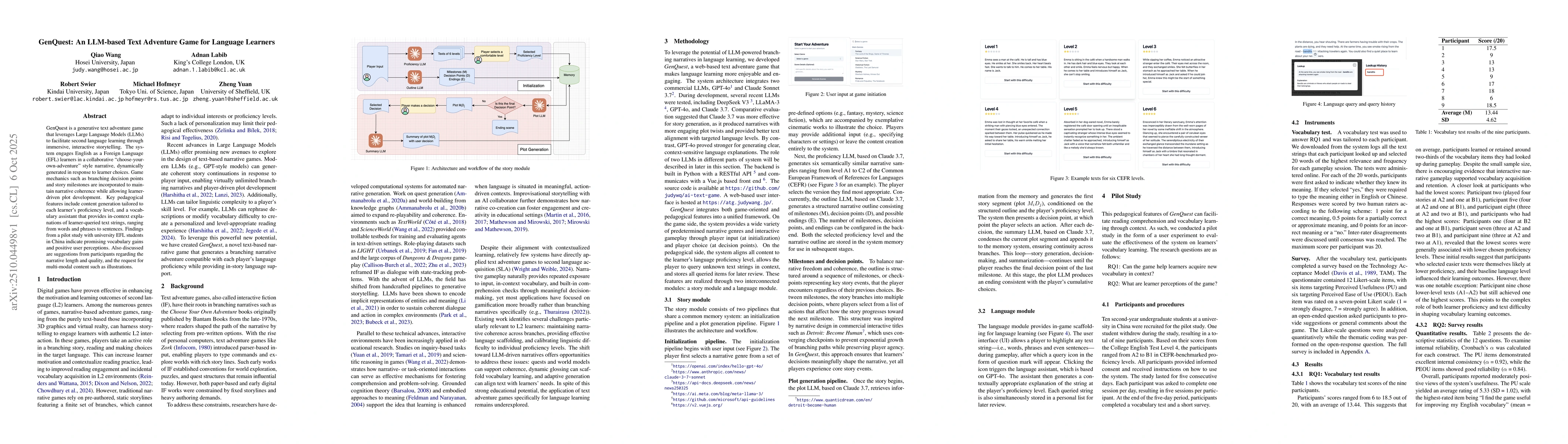 The paper presents GenQuest, an LLM-based text adventure game that dynamically generates story segments based on learner choices and proficiency levels, incorporating a vocabulary assistant for in-context language explanations.