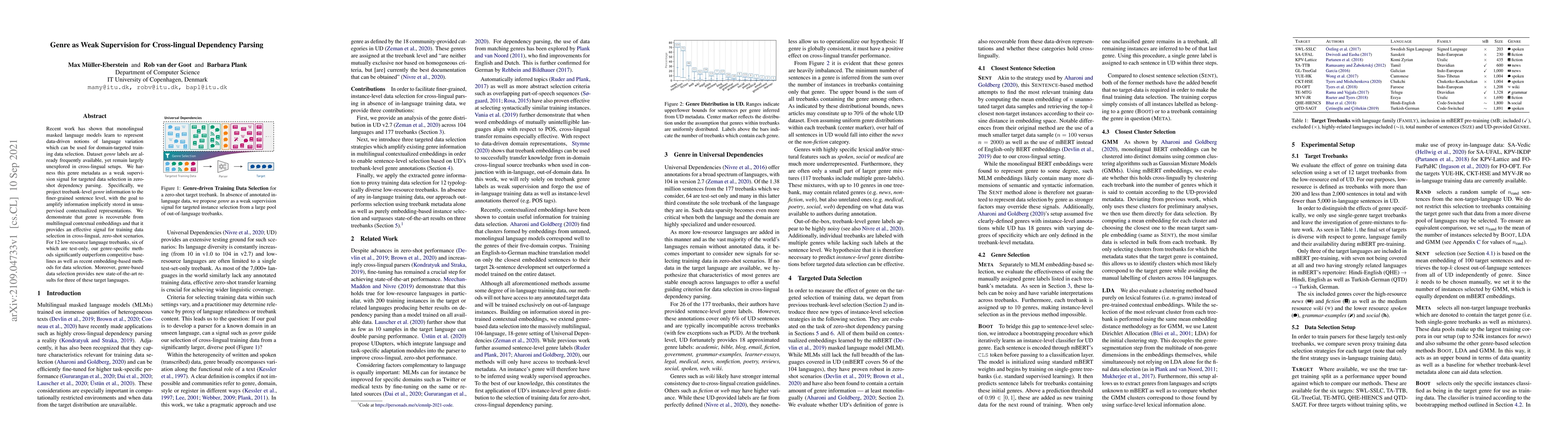This research paper uses genre metadata as a weak supervision signal to select targeted data for cross-lingual dependency parsing, achieving state-of-the-art results for low-resource languages.