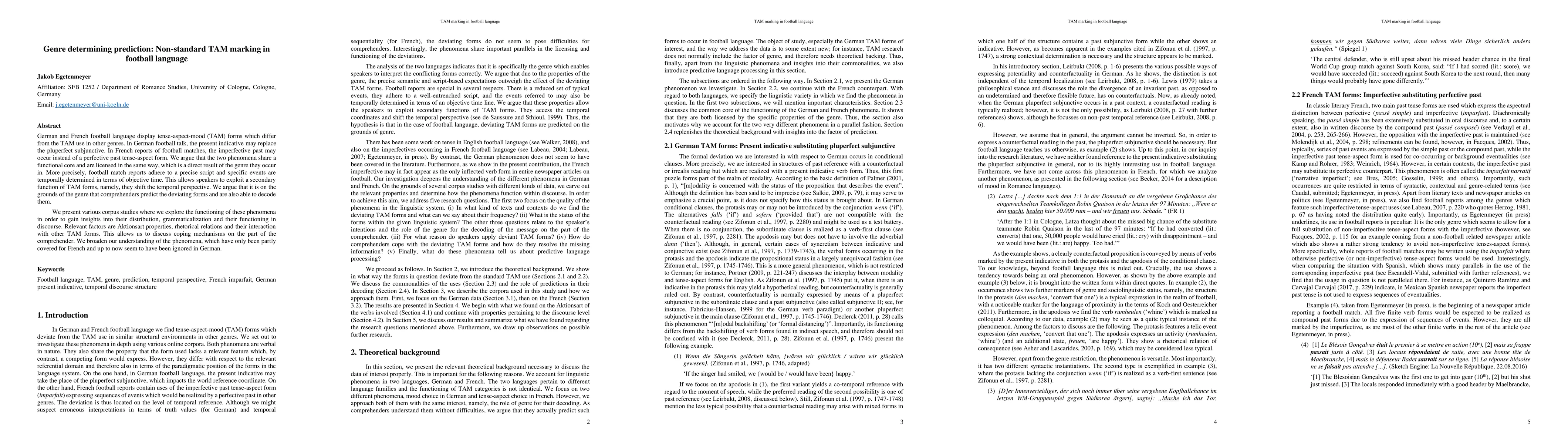German and French football language display tense-aspect-mood (TAM) forms which differ from the TAM use in other genres. In German football talk, the present indicative may replace the pluperfect subjunctive. In French reports of football matches, the imperfective past may occur instead of a perfective past tense-aspect form. We argue that the two phenomena share a functional core and are licensed in the same way, which is a direct result of the genre they occur in. More precisely, football match reports adhere to a precise script and specific events are temporally determined in terms of objective time. This allows speakers to exploit a secondary function of TAM forms, namely, they shift the temporal perspective. We argue that it is on the grounds of the genre that comprehenders predict the deviating forms and are also able to decode them. We present various corpus studies where we explore the functioning of these phenomena in order to gain insights into their distribution, grammaticalization and their functioning in discourse. Relevant factors are Aktionsart properties, rhetorical relations and their interaction with other TAM forms. This allows us to discuss coping mechanisms on the part of the comprehender. We broaden our understanding of the phenomena, which have only been partly covered for French and up to now seem to have been ignored in German.
