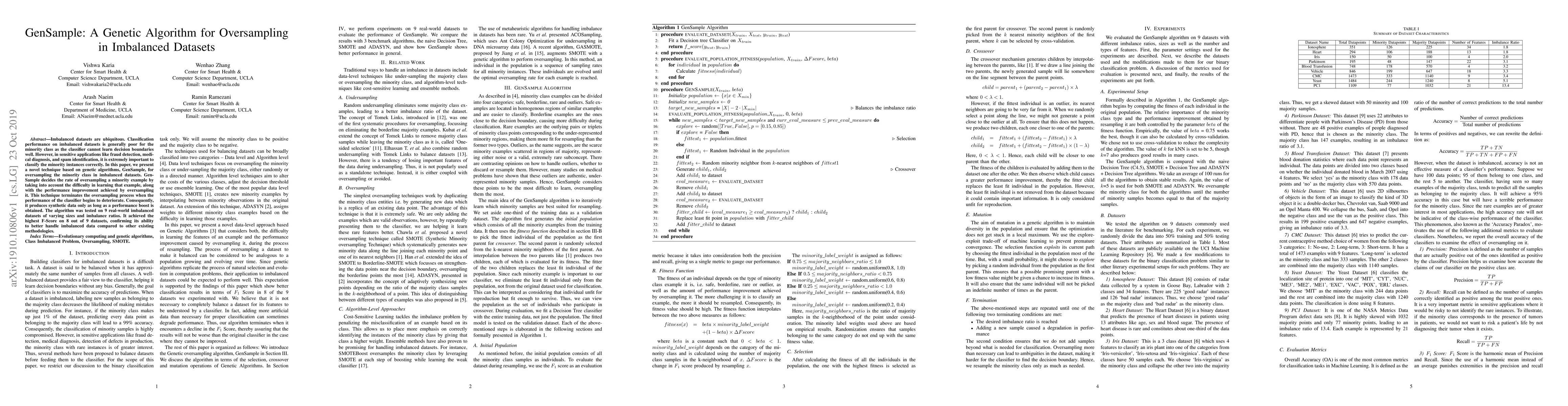 GenSample employs a genetic algorithm to oversample the minority class in imbalanced datasets, optimizing the rate of oversampling based on example difficulty and performance gains. The method effectively balances synthetic data generation with classifier performance, achieving the highest F-Score on 8 out of 9 tested datasets.