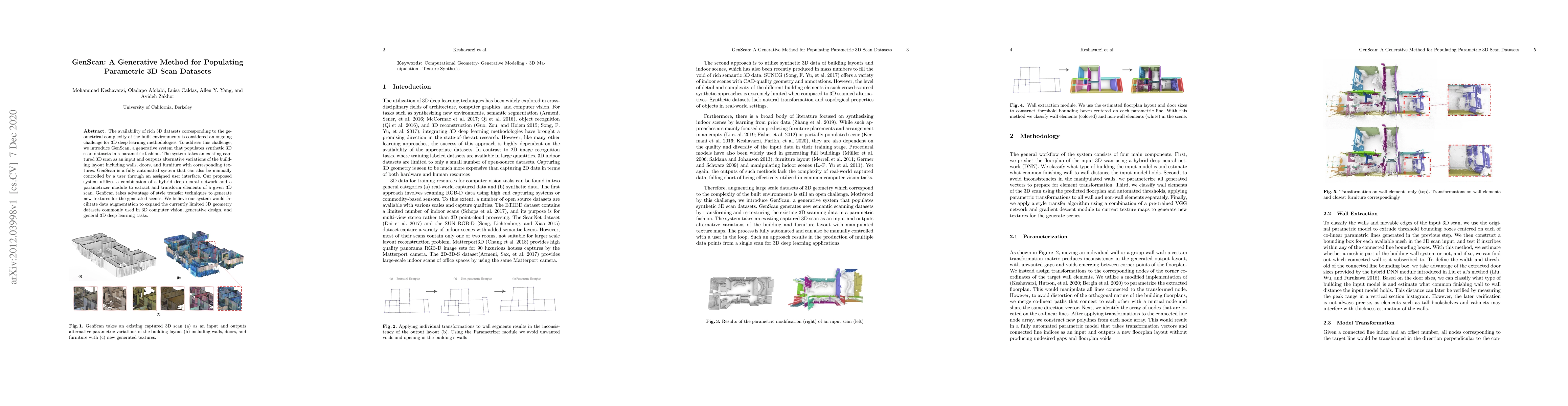 The availability of rich 3D datasets corresponding to the geometrical complexity of the built environments is considered an ongoing challenge for 3D deep learning methodologies. To address this challenge, we introduce GenScan, a generative system that populates synthetic 3D scan datasets in a parametric fashion. The system takes an existing captured 3D scan as an input and outputs alternative variations of the building layout including walls, doors, and furniture with corresponding textures. GenScan is a fully automated system that can also be manually controlled by a user through an assigned user interface. Our proposed system utilizes a combination of a hybrid deep neural network and a parametrizer module to extract and transform elements of a given 3D scan. GenScan takes advantage of style transfer techniques to generate new textures for the generated scenes. We believe our system would facilitate data augmentation to expand the currently limited 3D geometry datasets commonly used in 3D computer vision, generative design, and general 3D deep learning tasks.