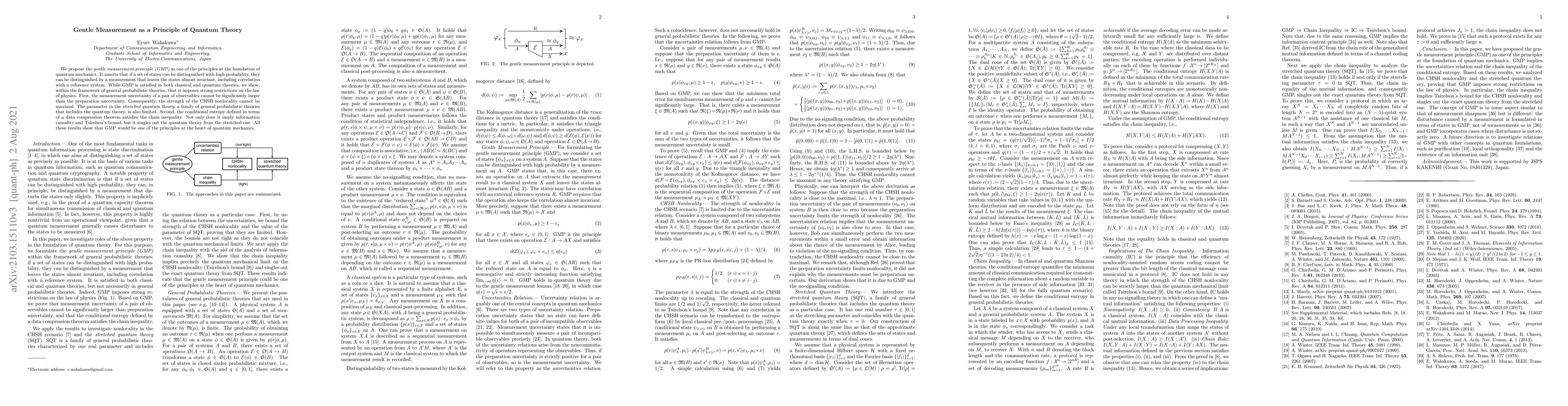 We propose the gentle measurement principle (GMP) as one of the principles at the foundation of quantum mechanics. It asserts that if a set of states can be distinguished with high probability, they can be distinguished by a measurement that leaves the states almost invariant, including correlation with a reference system. While GMP is satisfied in both classical and quantum theories, we show, within the framework of general probabilistic theories, that it imposes strong restrictions on the law of physics. First, the measurement uncertainty of a pair of observables cannot be significantly larger than the preparation uncertainty. Consequently, the strength of the CHSH nonlocality cannot be maximal. The parameter in the stretched quantum theory, a family of general probabilistic theories that includes the quantum theory, is also limited. Second, the conditional entropy defined in terms of a data compression theorem satisfies the chain inequality. Not only does it imply information causality and Tsirelson's bound, but it singles out the quantum theory from the stretched one. All these results show that GMP would be one of the principles at the heart of quantum mechanics.