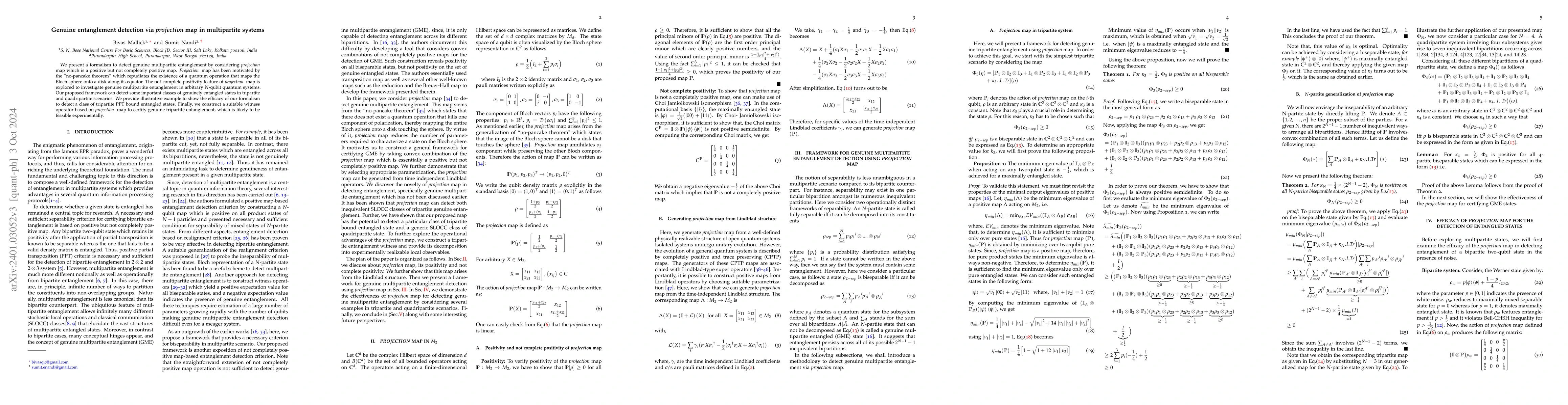 This paper proposes a formalism using a projection map to detect genuine multipartite entanglement in quantum systems, leveraging its not-completely positive nature. The method is shown to identify both W and GHZ states in tripartite systems and is robust against noise, with a general framework for certifying entanglement in N-qubit states.