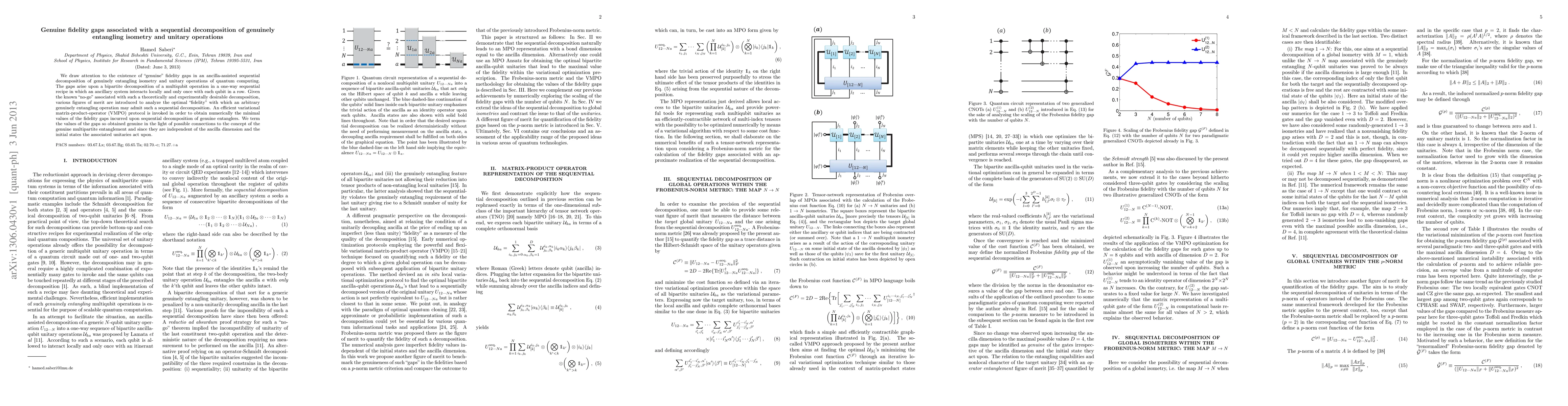 We draw attention to the existence of "genuine" fidelity gaps in an ancilla-assisted sequential decomposition of genuinely entangling isometry and unitary operations of quantum computing. The gaps arise upon a bipartite decomposition of a multiqubit operation in a one-way sequential recipe in which an ancillary system interacts locally and only once with each qubit in a row. Given the known "no-go" associated with such a theoretically and experimentally desirable decomposition, various figures of merit are introduced to analyze the optimal "fidelity" with which an arbitrary genuinely entangling operation may admit such a sequential decomposition. An efficient variational matrix-product-operator (VMPO) protocol is invoked in order to obtain numerically the minimal values of the fidelity gaps incurred upon sequential decomposition of genuine entanglers. We term the values of the gaps so obtained genuine in the light of possible connections to the concept of the genuine multipartite entanglement and since they are independent of the ancilla dimension and the initial states the associated unitaries act upon.