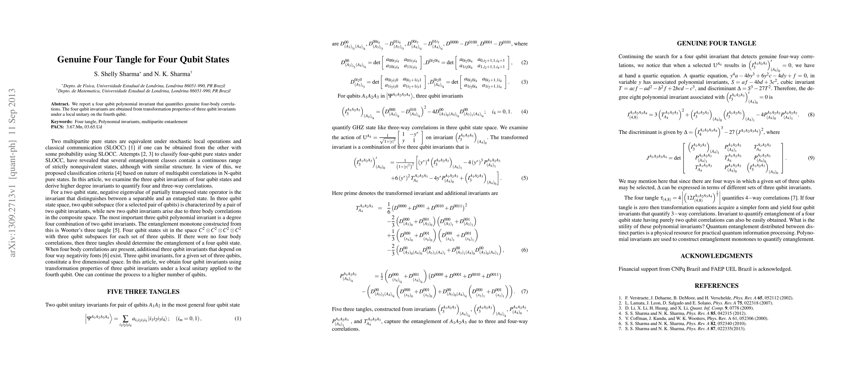 Summary: This paper introduces a four qubit polynomial invariant to measure genuine four-body correlations, derived from the transformation properties of three qubit invariants under local unitary operations on the fourth qubit. The invariant provides a new tool for analyzing multi-qubit entanglement.