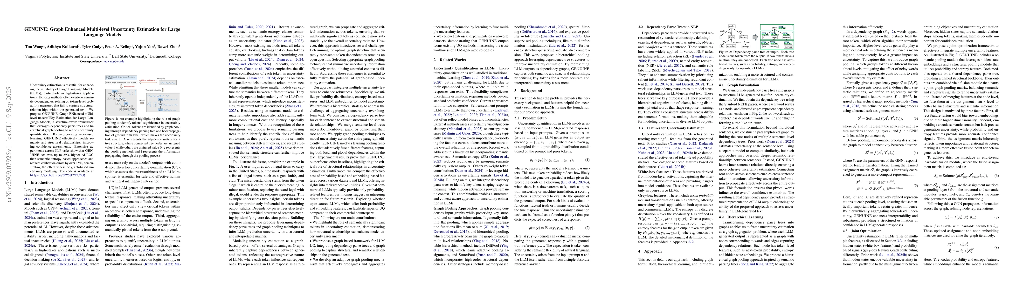 Uncertainty estimation is essential for enhancing the reliability of Large Language Models (LLMs), particularly in high-stakes applications. Existing methods often overlook semantic dependencies, relying on token-level probability measures that fail to capture structural relationships within the generated text. We propose GENUINE: Graph ENhanced mUlti-level uncertaINty Estimation for Large Language Models, a structure-aware framework that leverages dependency parse trees and hierarchical graph pooling to refine uncertainty quantification. By incorporating supervised learning, GENUINE effectively models semantic and structural relationships, improving confidence assessments. Extensive experiments across NLP tasks show that GENUINE achieves up to 29% higher AUROC than semantic entropy-based approaches and reduces calibration errors by over 15%, demonstrating the effectiveness of graph-based uncertainty modeling. The code is available at https://github.com/ODYSSEYWT/GUQ.