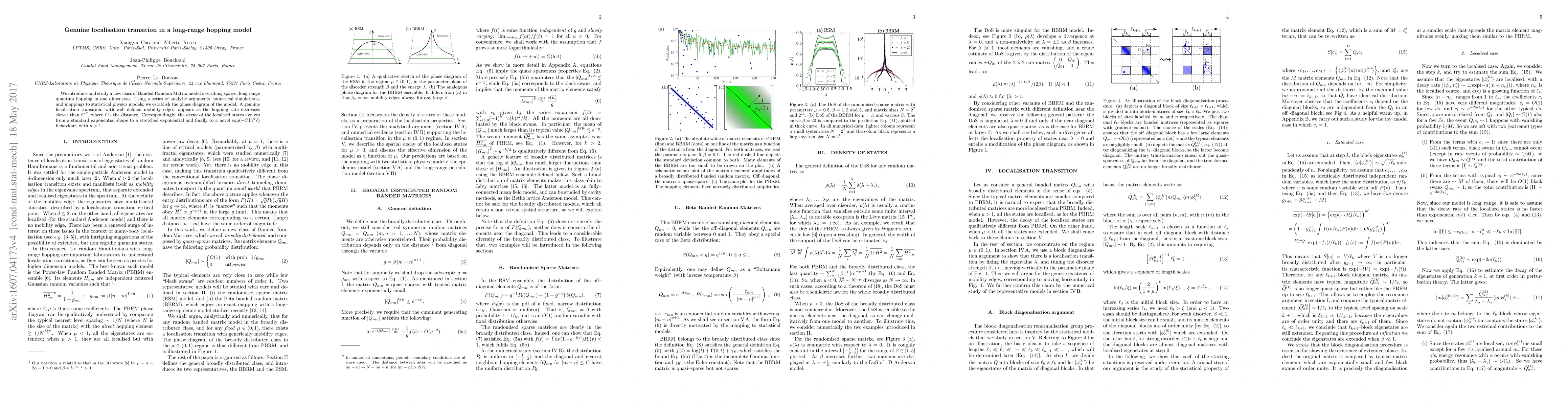 We introduce and study a new class of Banded Random Matrix model describing sparse, long range quantum hopping in one dimension. Using a series of analytic arguments, numerical simulations, and mappings to statistical physics models, we establish the phase diagram of the model. A genuine localisation transition, with well defined mobility edges, appears as the hopping rate decreases slower than $\ell^{-2}$, where $\ell$ is the distance. Correspondingly, the decay of the localised states evolves from a standard exponential shape to a stretched exponential and finally to a novel $\exp(-C\ln^\kappa \ell)$ behaviour, with $\kappa > 1$.