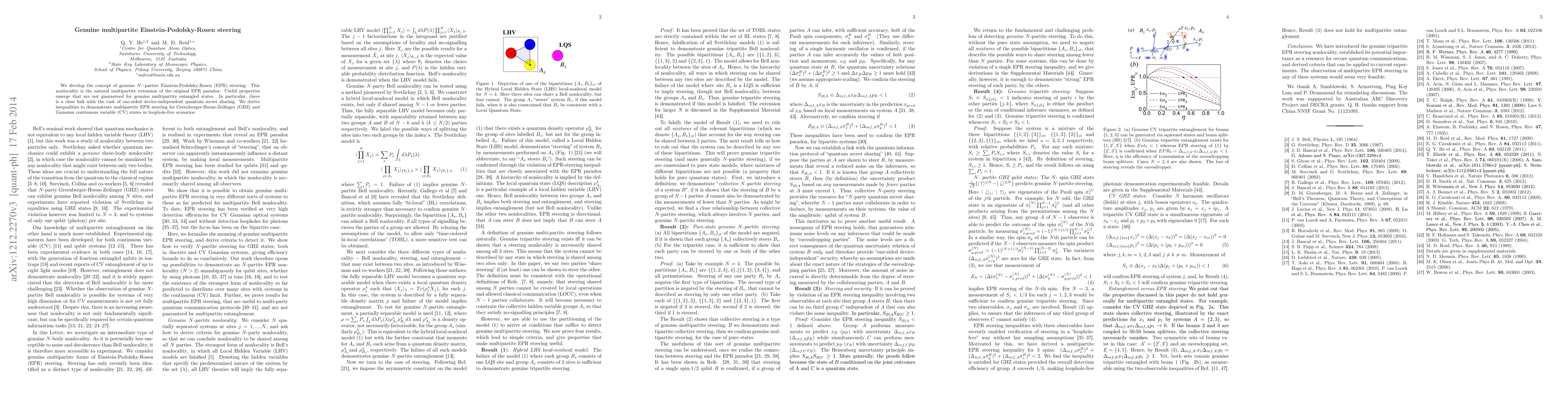 This paper introduces genuine multipartite Einstein-Podolsky-Rosen (EPR) steering, extending the original EPR paradox to multiple parties, and demonstrates its unique properties. It also establishes inequalities to show multipartite EPR steering in GHZ and Gaussian continuous variable states, highlighting its relevance to one-sided device-independent quantum secret sharing.