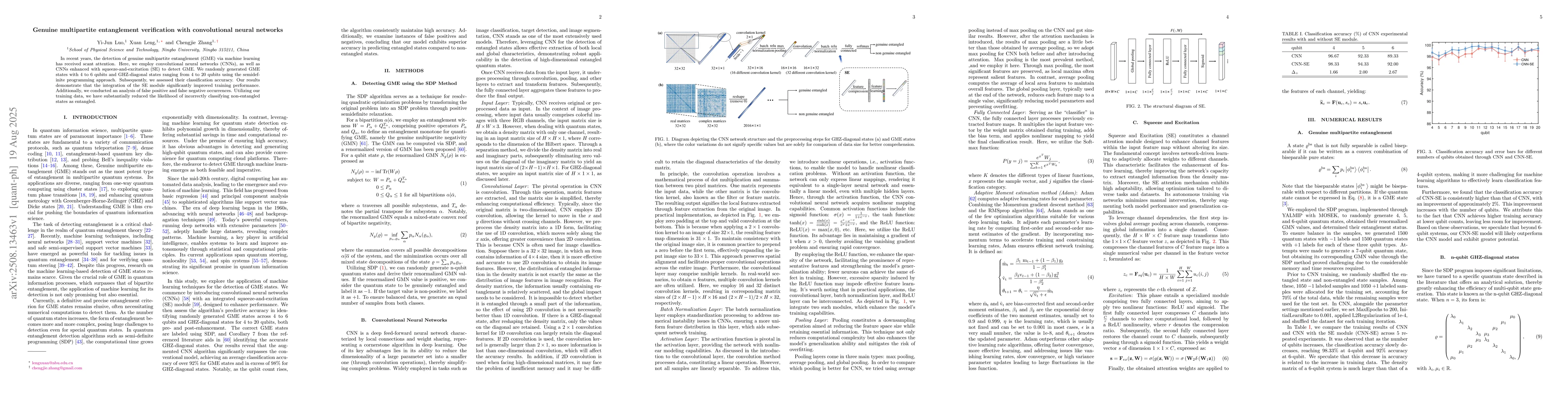 The research employs convolutional neural networks (CNNs) and CNNs enhanced with squeeze-and-excitation (SE) modules to detect genuine multipartite entanglement (GME). GME states with 4 to 6 qubits and GHZ-diagonal states from 4 to 20 qubits are generated using semidefinite programming and classified.