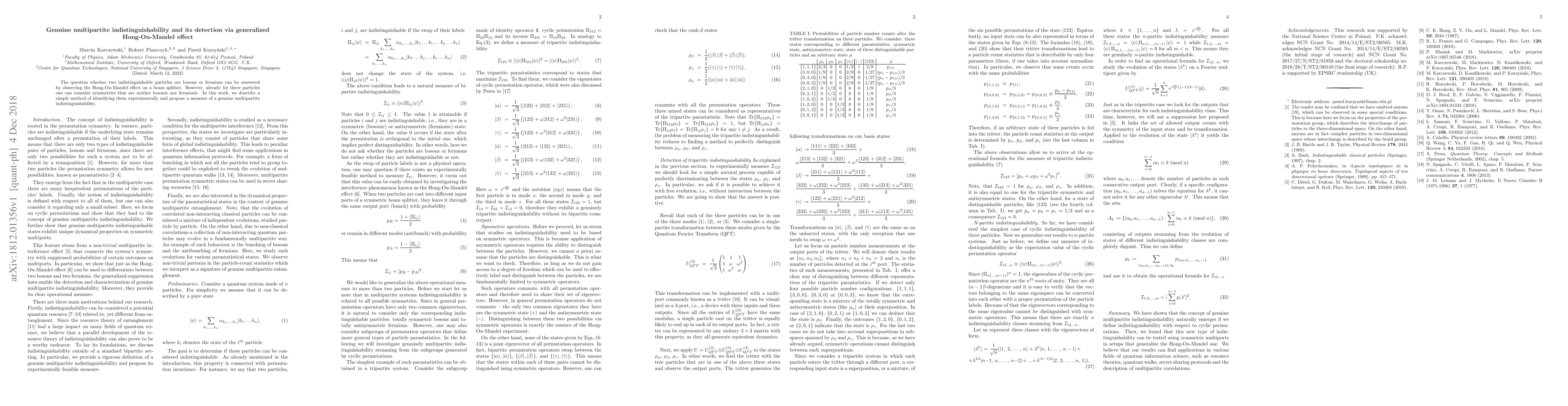 This paper proposes a method to detect genuine multipartite indistinguishability beyond simple boson-fermion classification using the generalized Hong-Ou-Mandel effect on a beam splitter. It introduces a measure to identify symmetries that are neither bosonic nor fermionic for three or more indistinguishable particles.