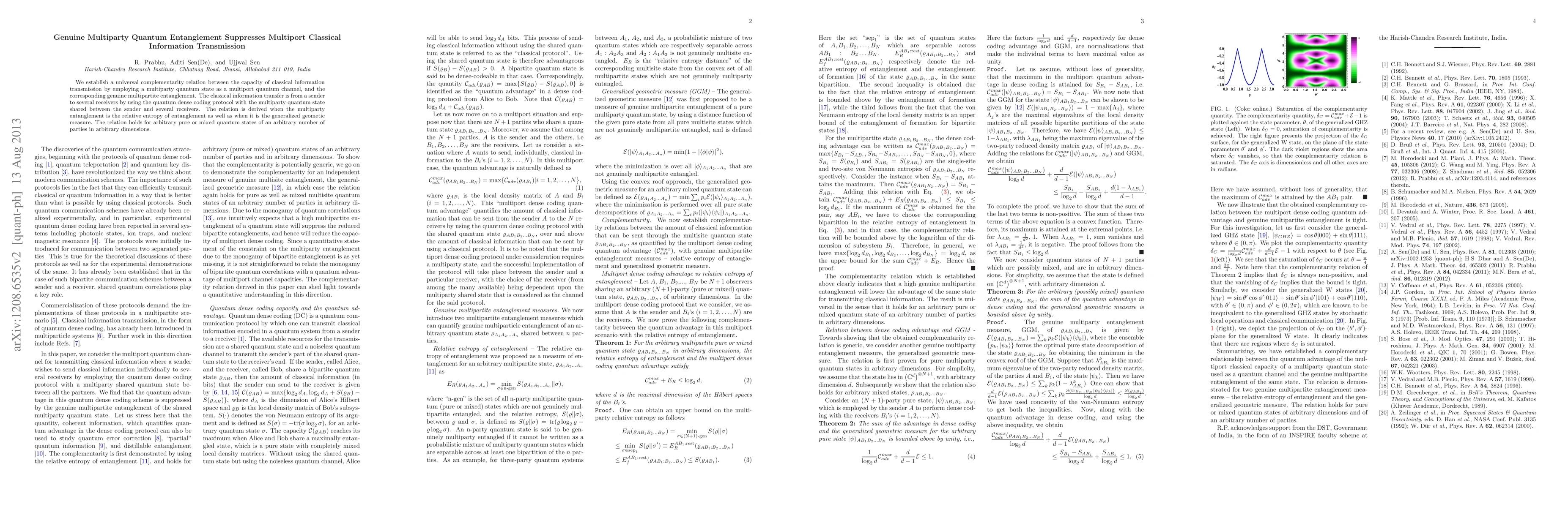 This paper demonstrates a universal complementarity between genuine multiparty quantum entanglement and the capacity for classical information transmission through a multiport quantum channel. It shows that increased genuine multipartite entanglement in quantum states suppresses classical information transfer using quantum dense coding.