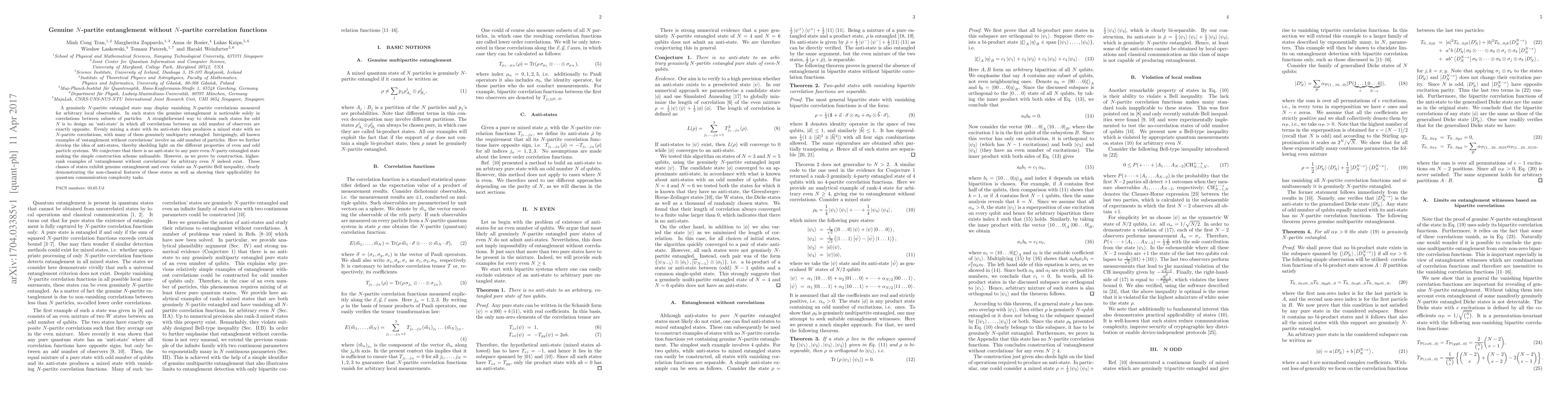 A genuinely $N$-partite entangled state may display vanishing $N$-partite correlations measured for arbitrary local observables. In such states the genuine entanglement is noticeable solely in correlations between subsets of particles. A straightforward way to obtain such states for odd $N$ is to design an `anti-state' in which all correlations between an odd number of observers are exactly opposite. Evenly mixing a state with its anti-state then produces a mixed state with no $N$-partite correlations, with many of them genuinely multiparty entangled. Intriguingly, all known examples of `entanglement without correlations' involve an \emph{odd} number of particles. Here we further develop the idea of anti-states, thereby shedding light on the different properties of even and odd particle systems. We conjecture that there is no anti-state to any pure even-$N$-party entangled state making the simple construction scheme unfeasable. However, as we prove by construction, higher-rank examples of `entanglement without correlations' for arbitrary even $N$ indeed exist. These classes of states exhibit genuine entanglement and even violate an $N$-partite Bell inequality, clearly demonstrating the non-classical features of these states as well as showing their applicability for quantum communication complexity tasks.