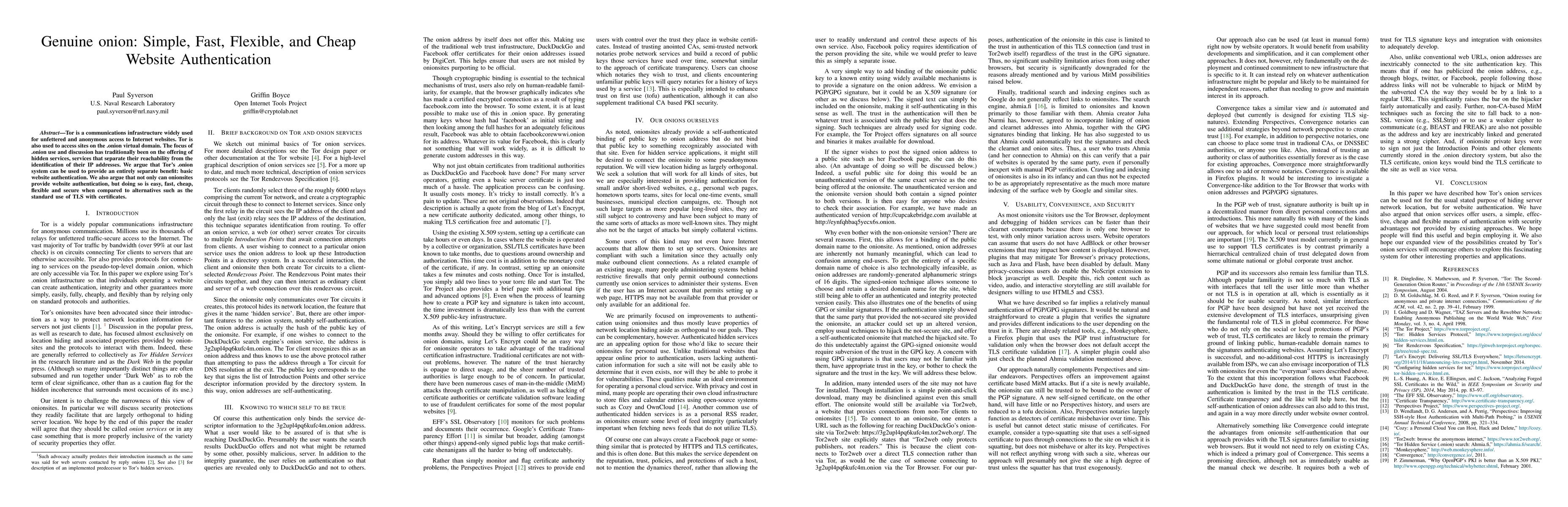 This paper proposes using Tor's .onion system for simple, fast, and secure website authentication, arguing it is more flexible and cost-effective than traditional TLS-based methods. It highlights the potential of .onion sites to offer robust authentication without the complexities and costs associated with conventional certificate-based systems.