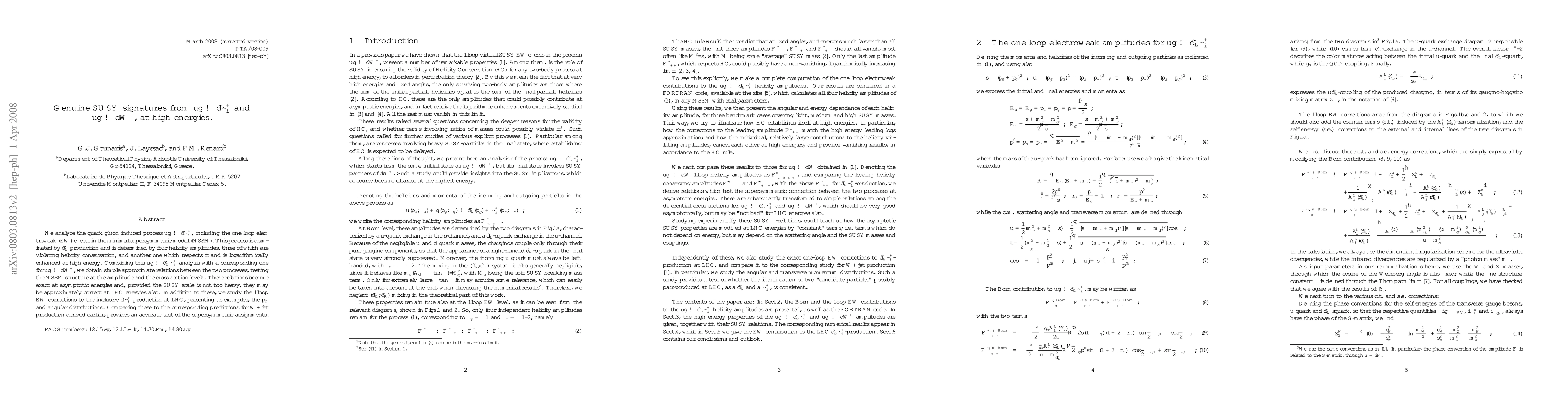 We analyze the quark-gluon induced process $u g\to \tilde d\tchi_i^+$, including the one loop electroweak (EW) effects in the minimal supersymmetric model (MSSM). This process is determined by four helicity amplitudes, three of which are violating helicity conservation, and another one which respects it and is logarithmically enhanced at high energy. Combining this $u g\to \tilde d\tchi_i^+$ analysis with a corresponding one for $u g \to d W^+$, we obtain simple approximate relations between the two processes, testing the MSSM structure at the amplitude and the cross section levels. These relations become exact at asymptotic energies and, provided the SUSY scale is not too heavy, they may be approximately correct at LHC energies also. In addition to these, we study the 1loop EW corrections to the inclusive $\tilde d\tchi_i^+$ production at LHC, presenting as examples, the $p_T$ and angular distributions. Comparing these to the corresponding predictions for $W$+jet production derived earlier, provides an accurate test of the supersymmetric assignments.