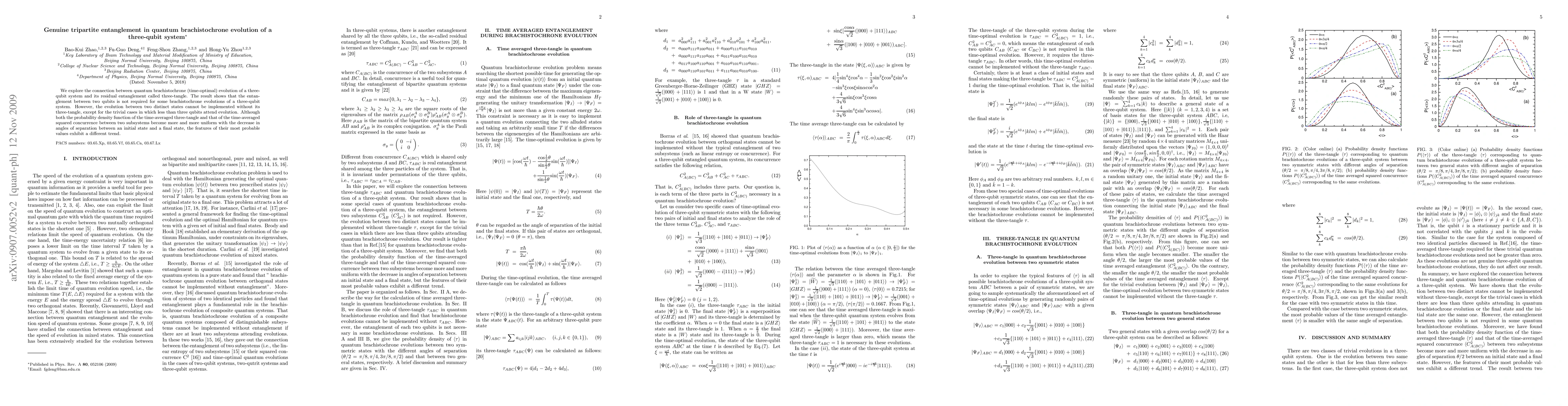 This paper investigates the relationship between quantum brachistochrone evolution of a three-qubit system and its residual entanglement, known as three-tangle. It reveals that genuine tripartite entanglement is essential for time-optimal evolutions between distinct states, even when entanglement between individual qubits is not present. The study also highlights differences in the probability density functions of time-averaged three-tangle and squared concurrence.