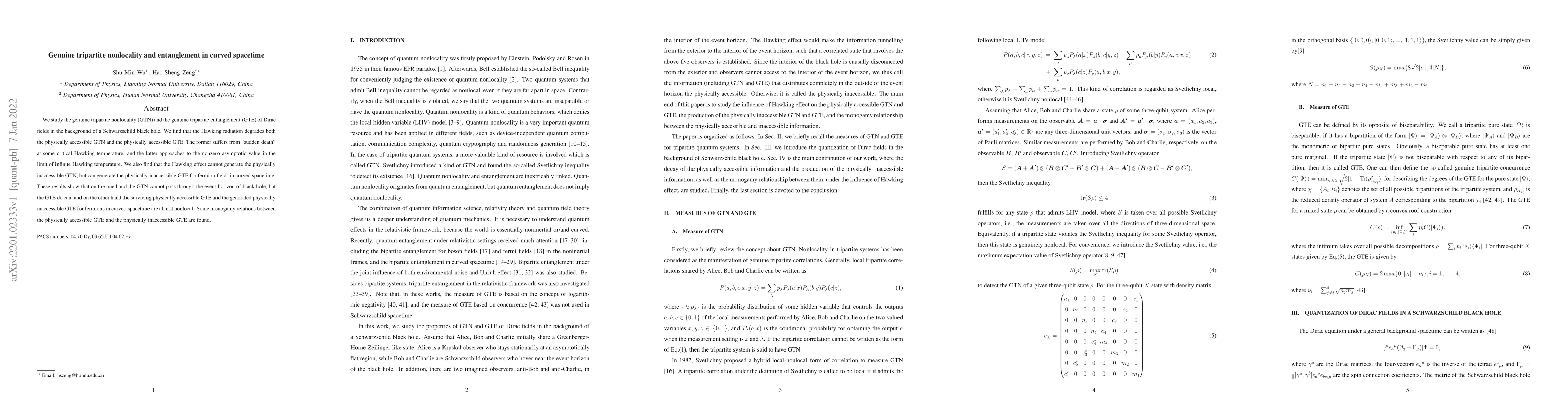 We study the genuine tripartite nonlocality (GTN) and the genuine tripartite entanglement (GTE) of Dirac fields in the background of a Schwarzschild black hole. We find that the Hawking radiation degrades both the physically accessible GTN and the physically accessible GTE. The former suffers from "sudden death" at some critical Hawking temperature, and the latter approaches to the nonzero asymptotic value in the limit of infinite Hawking temperature. We also find that the Hawking effect cannot generate the physically inaccessible GTN, but can generate the physically inaccessible GTE for fermion fields in curved spacetime. These results show that on the one hand the GTN cannot pass through the event horizon of black hole, but the GTE do can, and on the other hand the surviving physically accessible GTE and the generated physically inaccessible GTE for fermions in curved spacetime are all not nonlocal. Some monogamy relations between the physically accessible GTE and the physically inaccessible GTE are found.