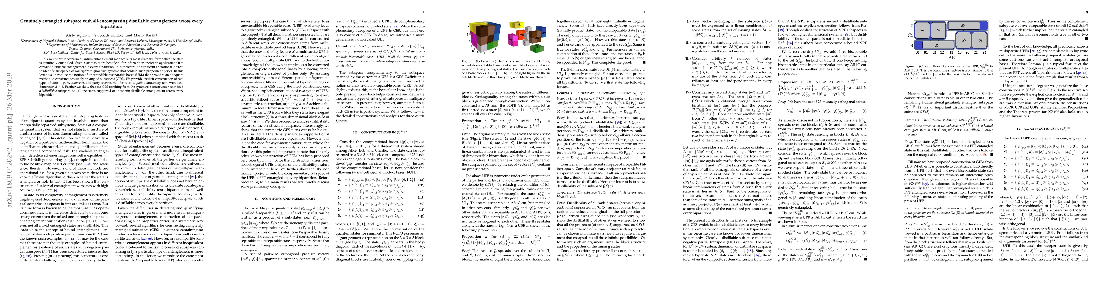 This paper introduces unextendible biseparable bases (UBB) to construct genuinely entangled subspaces (GES) in multipartite quantum systems. The authors provide explicit constructions of symmetric and asymmetric UBBs for 3-qudit systems, demonstrating that the GES from symmetric constructions exhibit distillable entanglement across every bipartition.